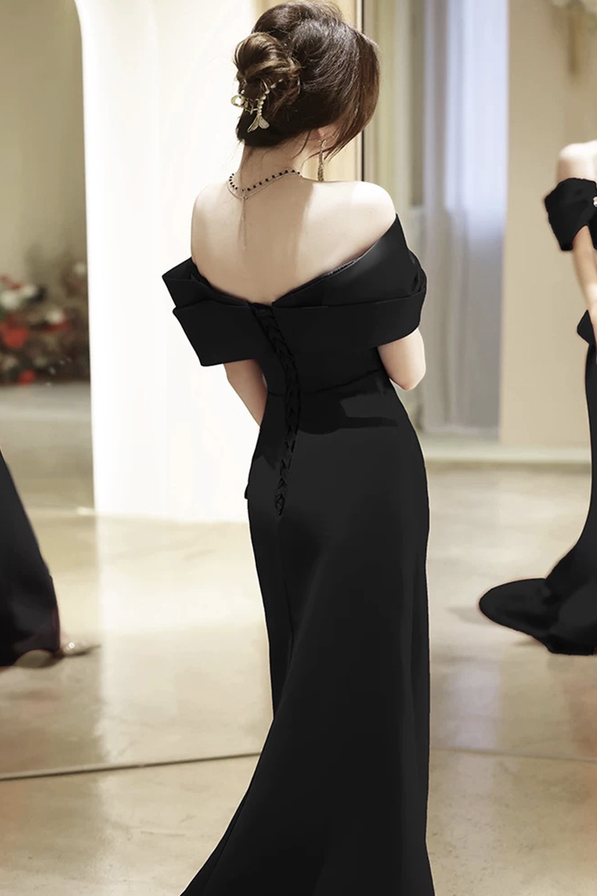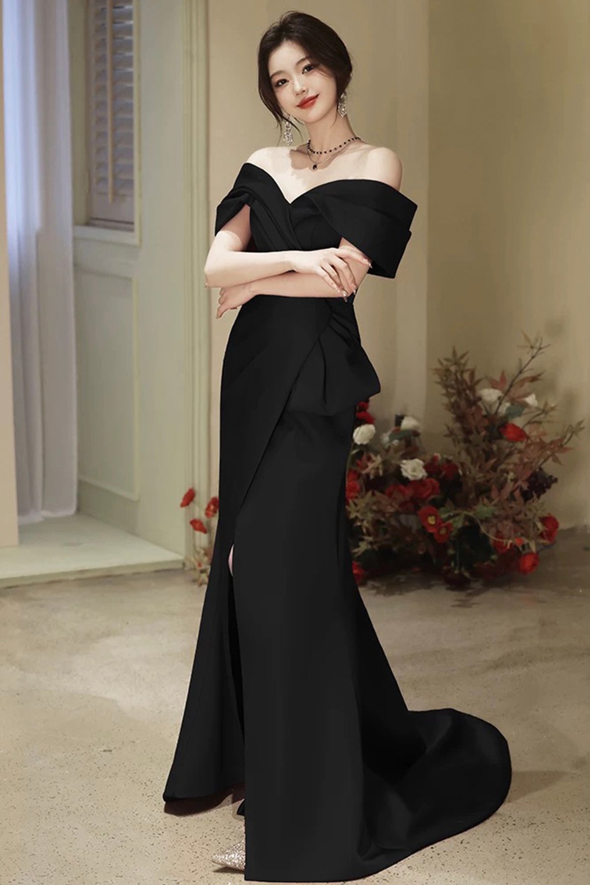 - Black A-Line Off the Shoulder Long Prom Party Dress with Slit -