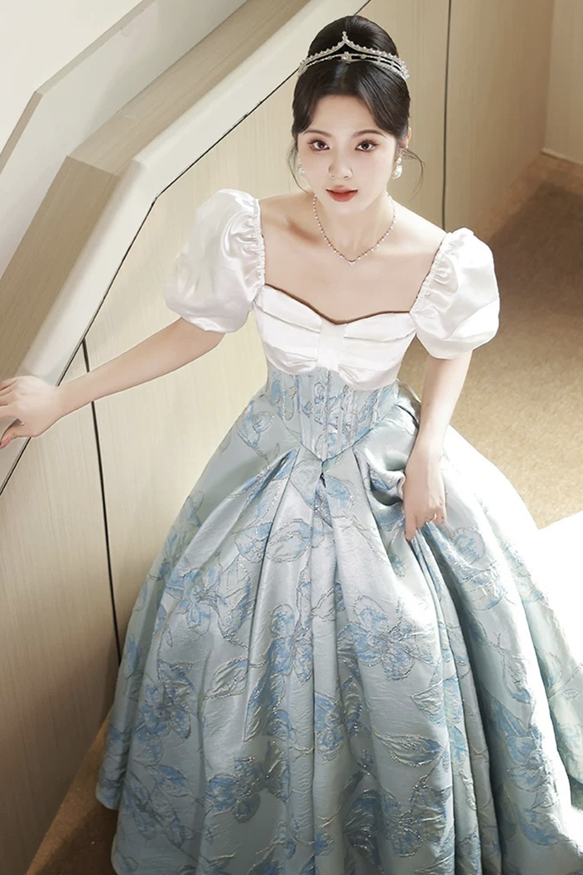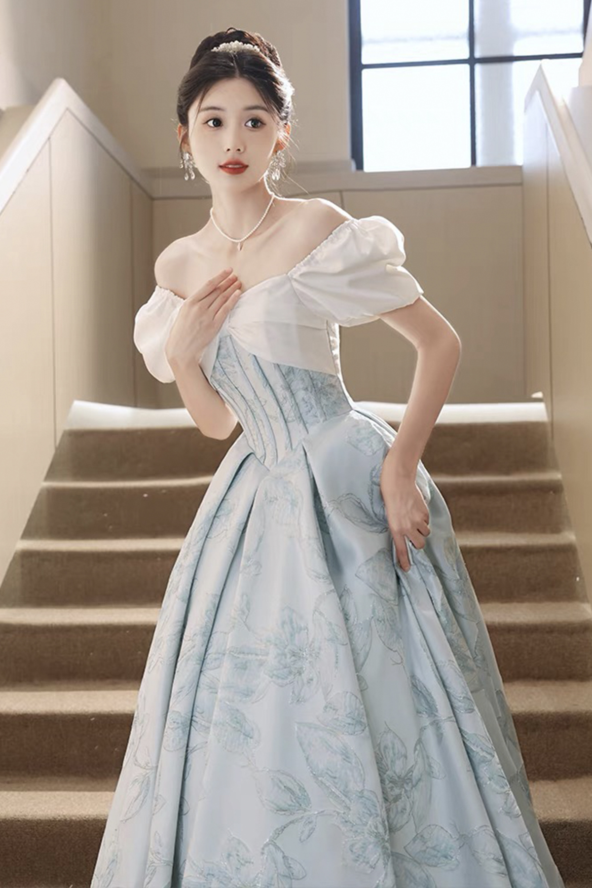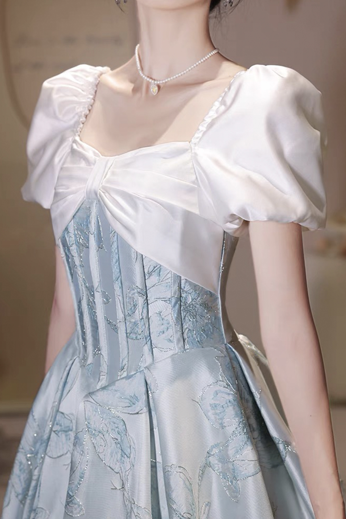 White and Blue Printed Pattern Long A-Line Prom Party Dress