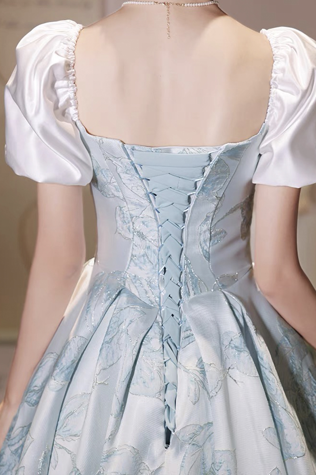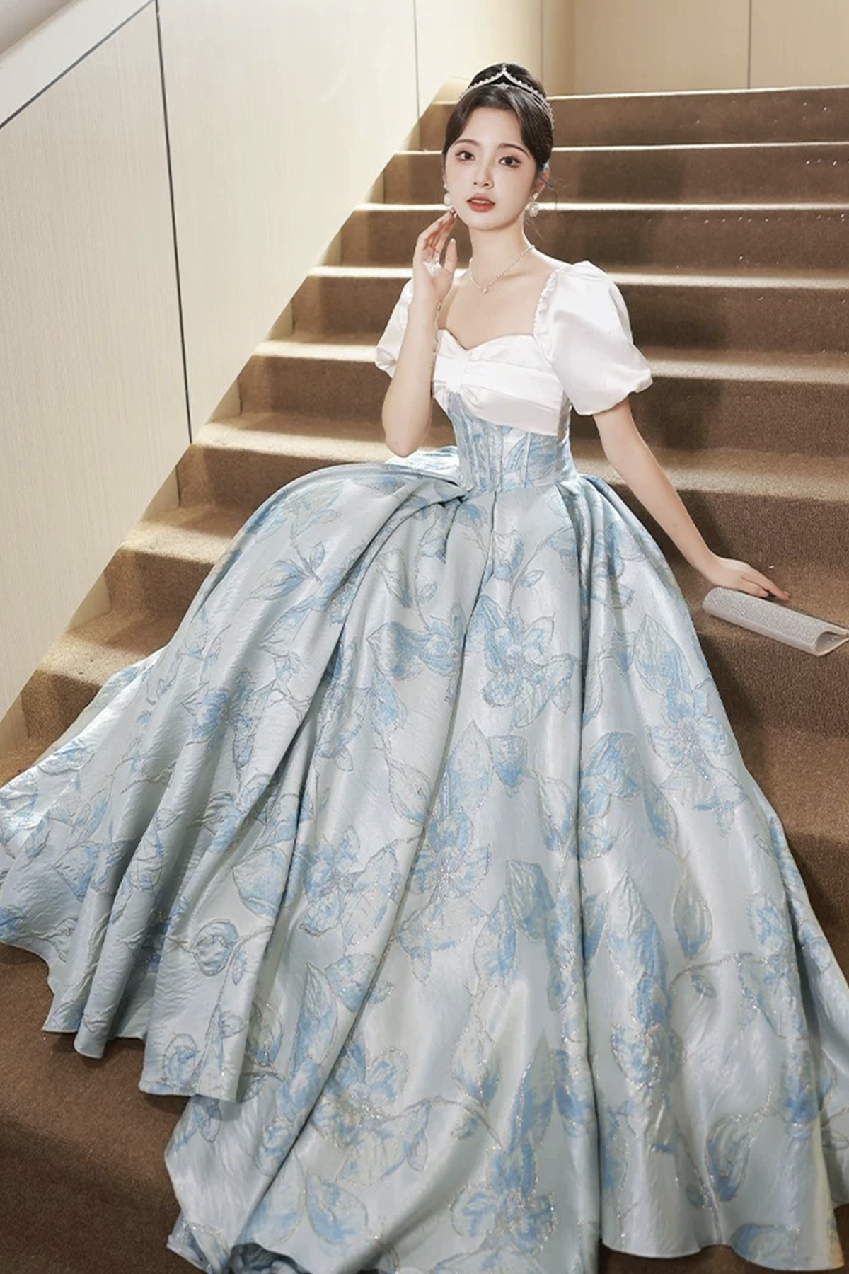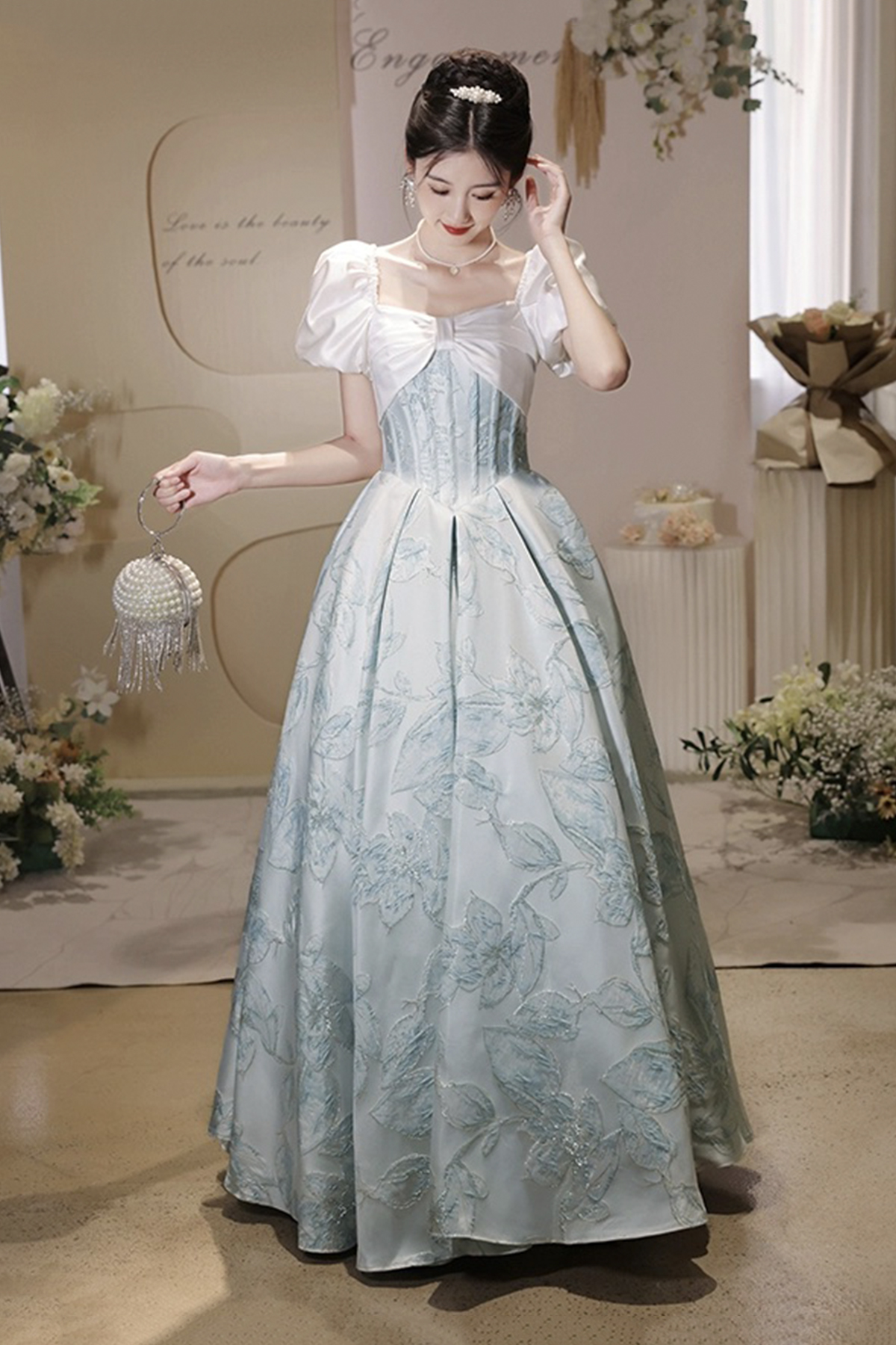 - White and Blue Printed Pattern Long A-Line Prom Party Dress -