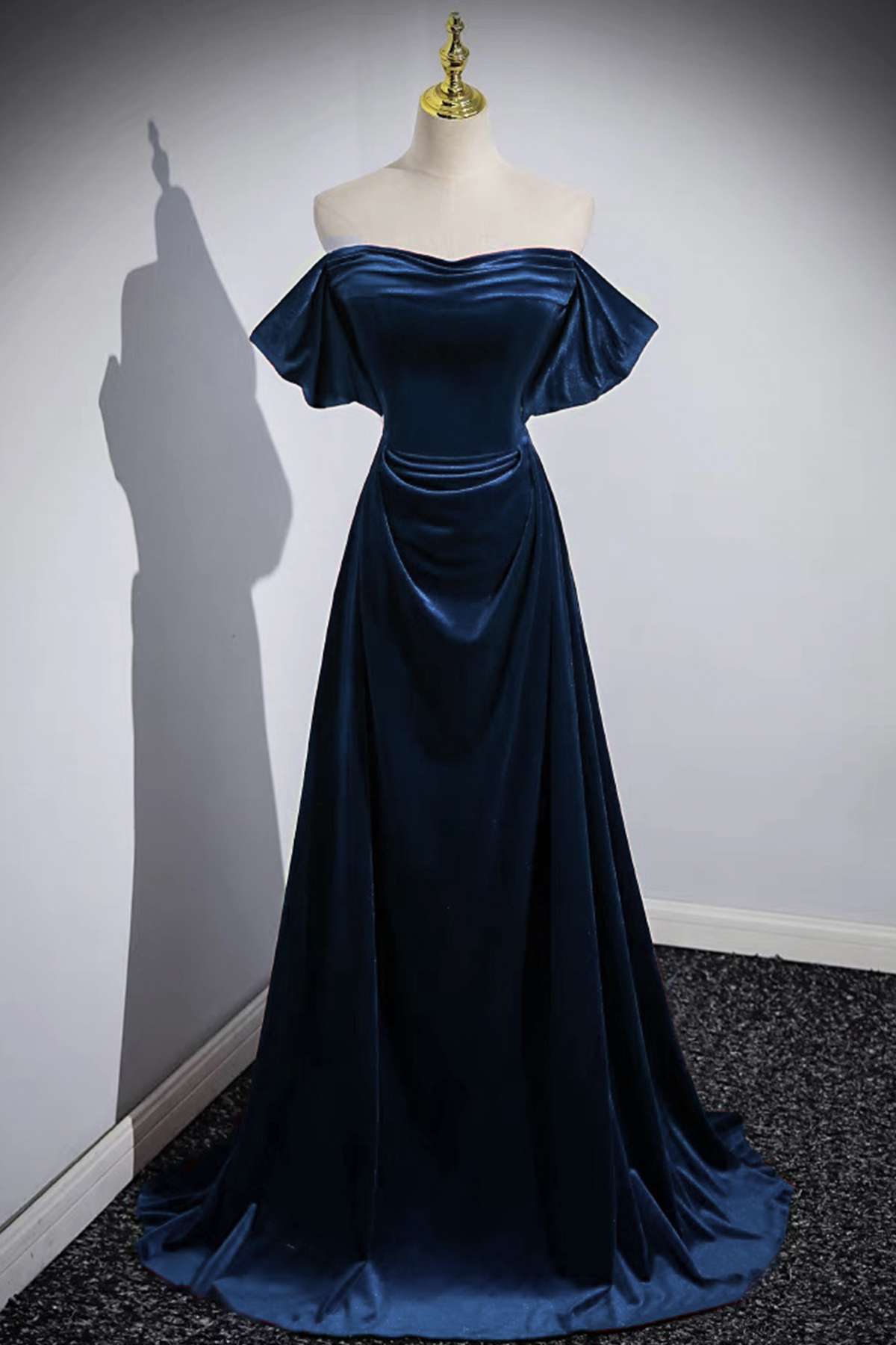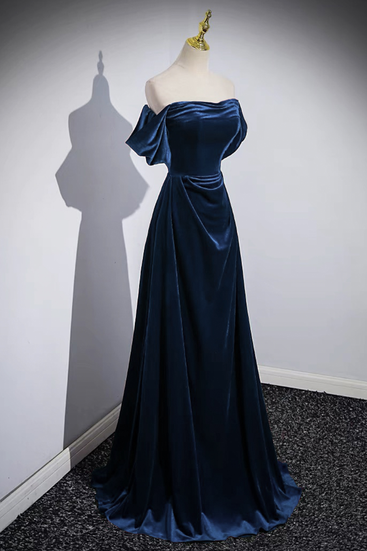 - Navy Velvet Long Prom Dress, Elegant Off the Shoulder Party Dress -