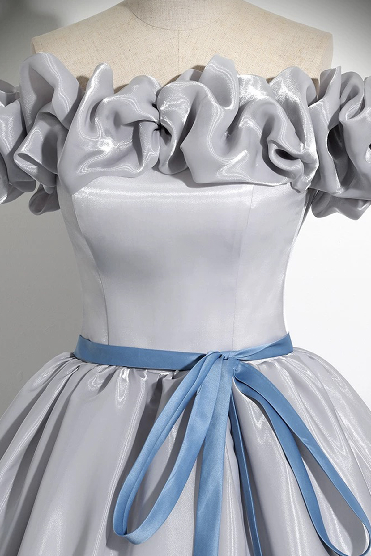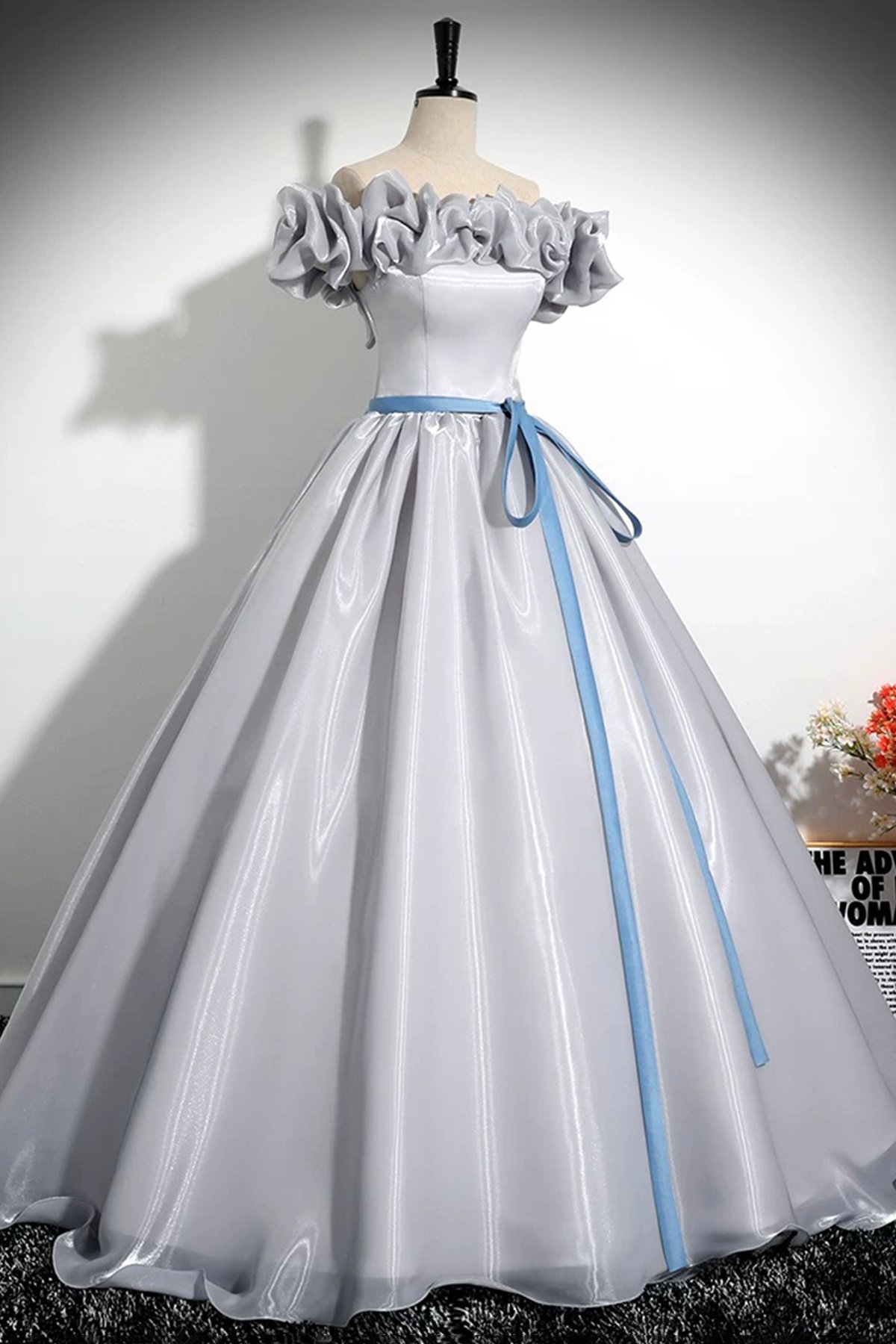 - Silver Organza Long A-Line Prom Dress, Off the Shoulder Evening Party Dress -