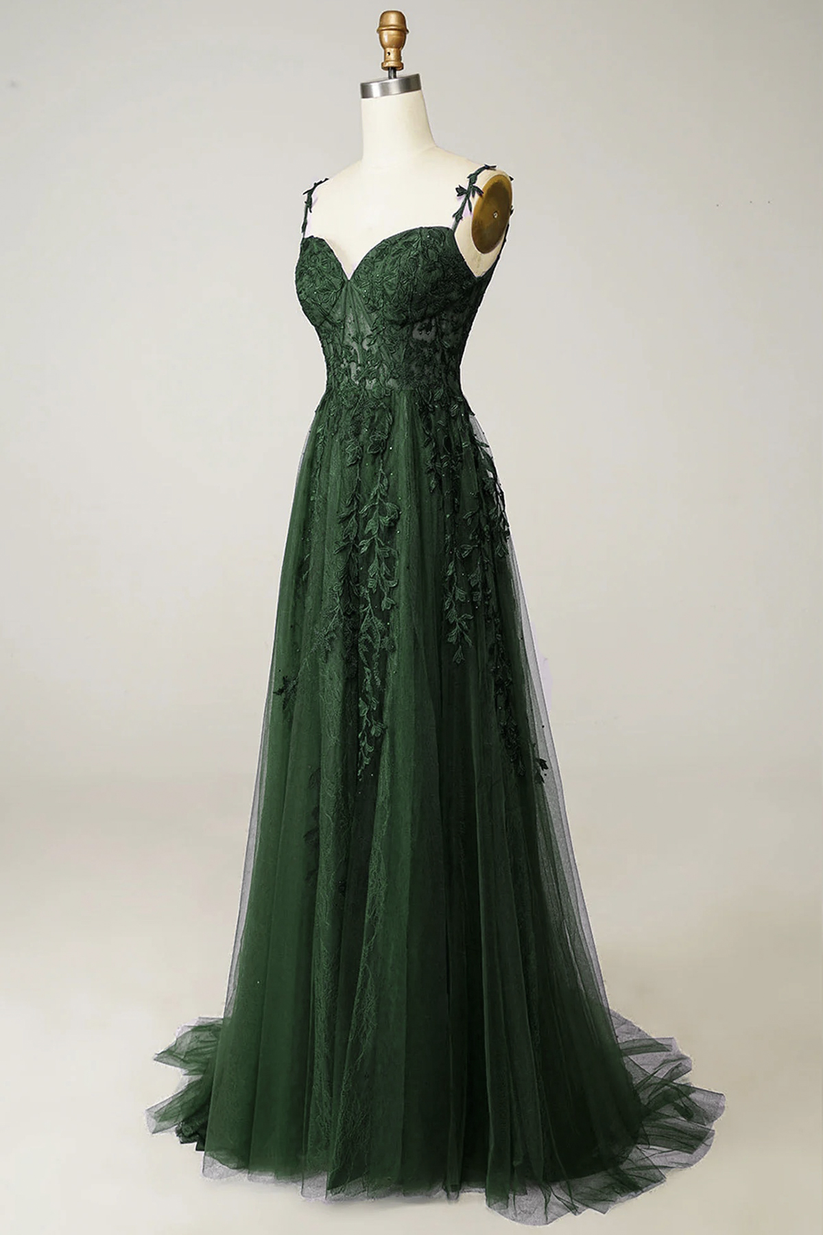 - Green Tulle Lace Long A-Line Prom Party Dress -