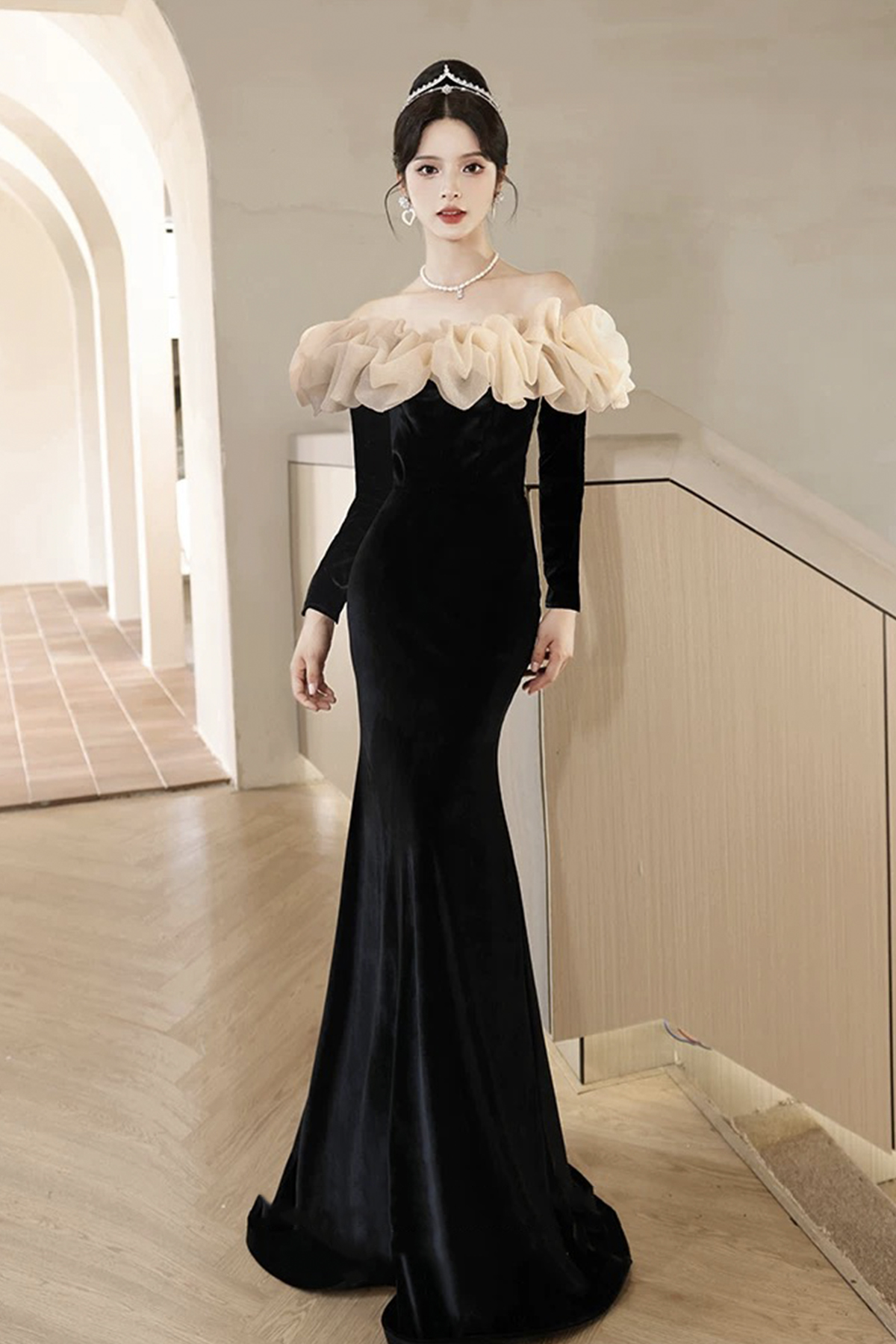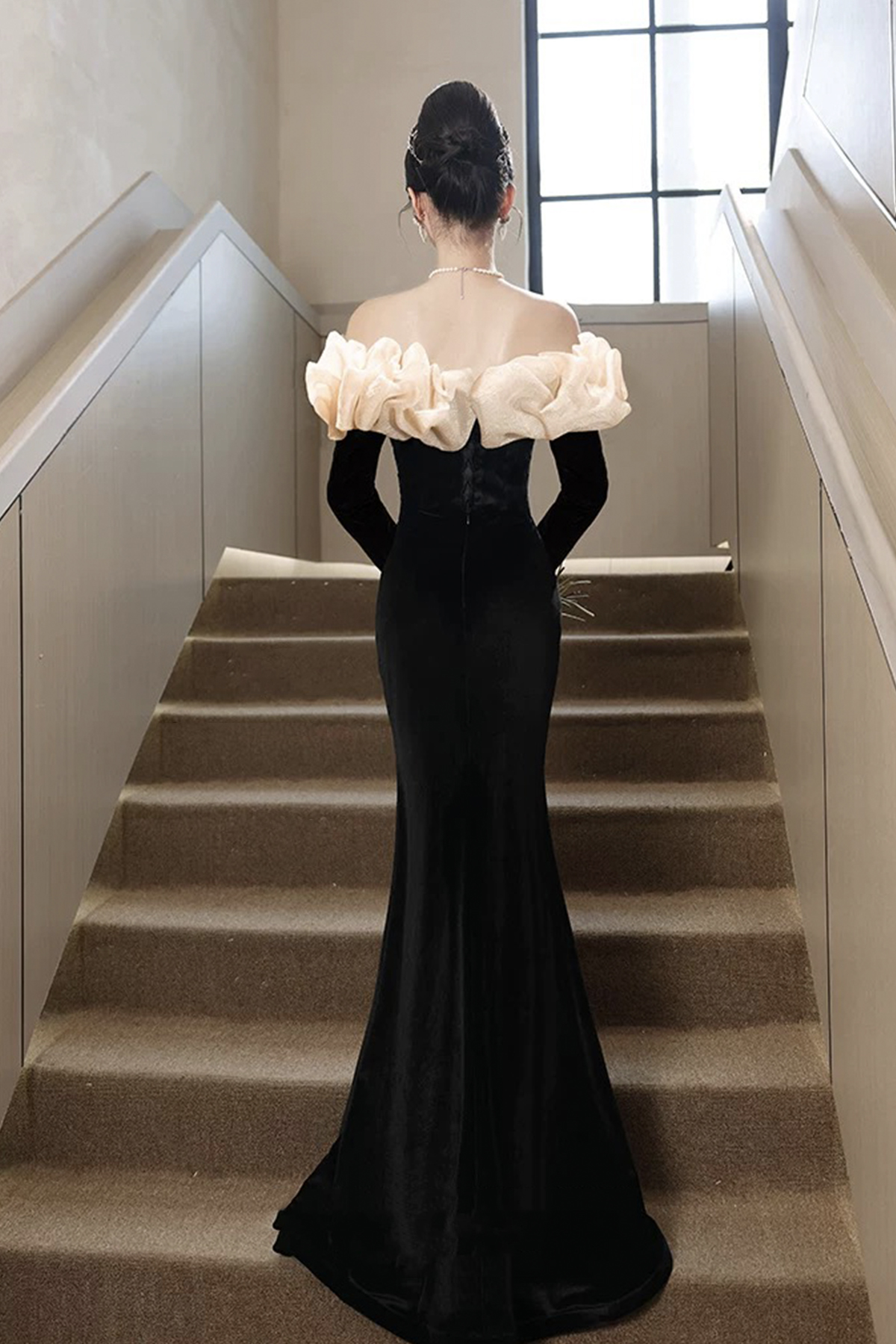 - Black Mermaid Velvet Long Sleeve Prom Party Dress -