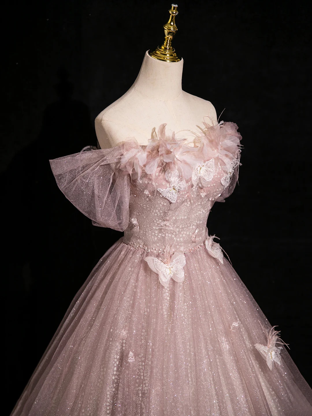 - Beautiful Pink Tulle Long A-Line Prom Dress with Flowers -