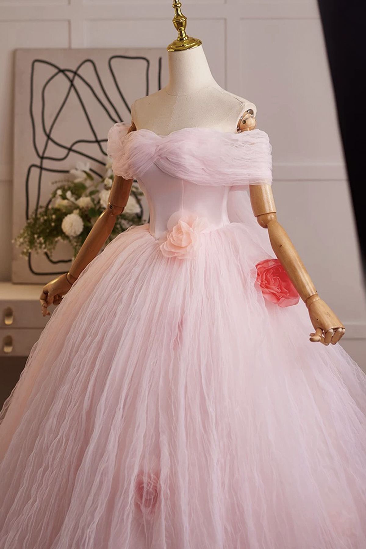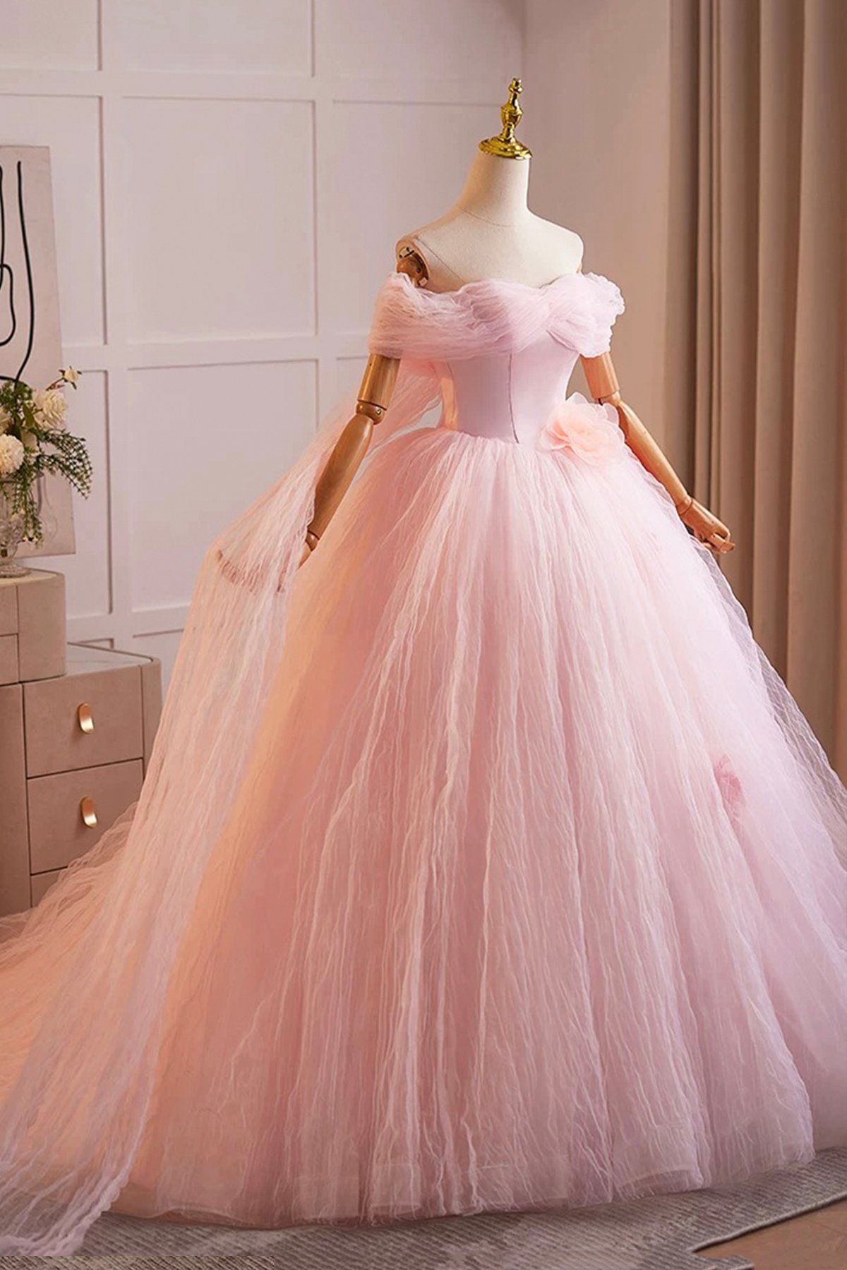 - Pink Tulle Off the Shoulder Prom Party Dress -