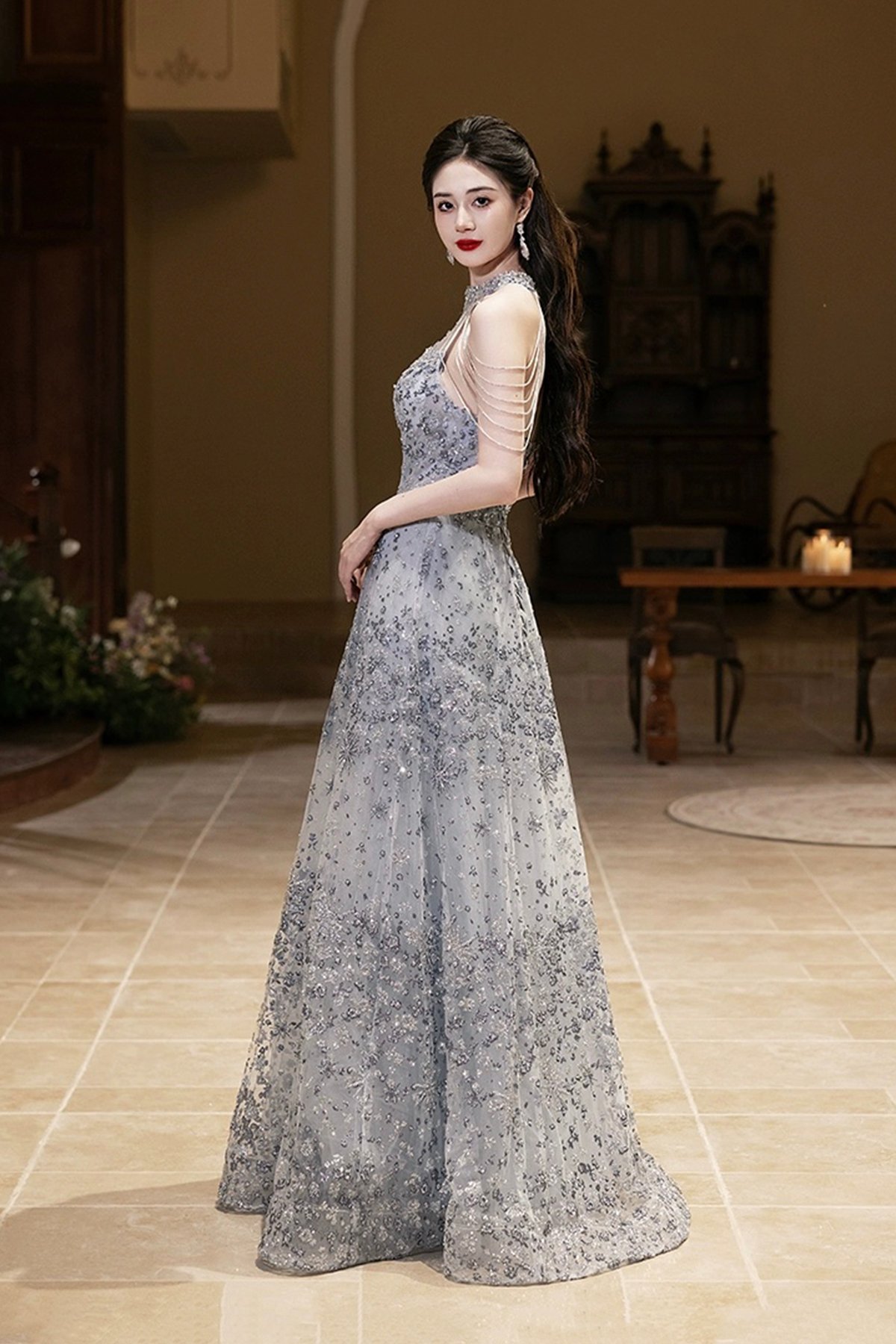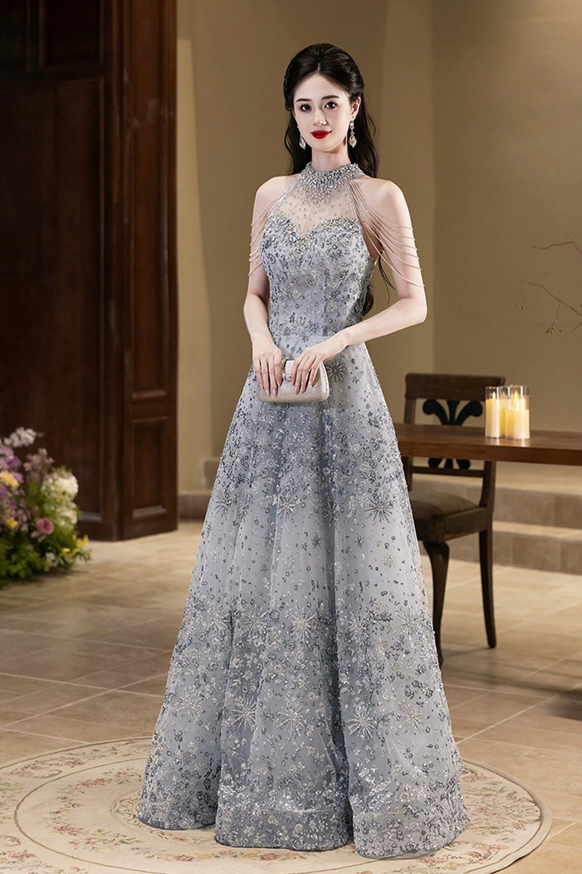 - Elegant Gray Tulle Sequins Long Prom Party Dress -