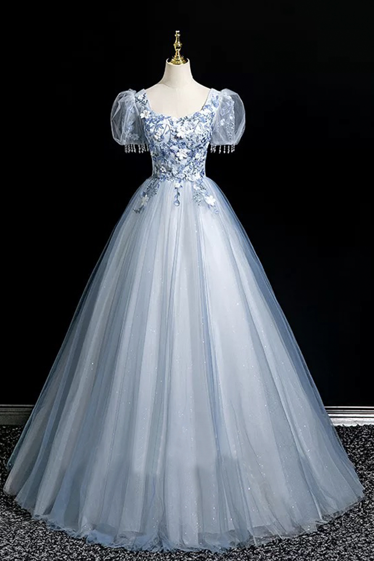 - Blue Tulle Lace Long Prom Dress, A-Line Short Sleeve Party Dress -