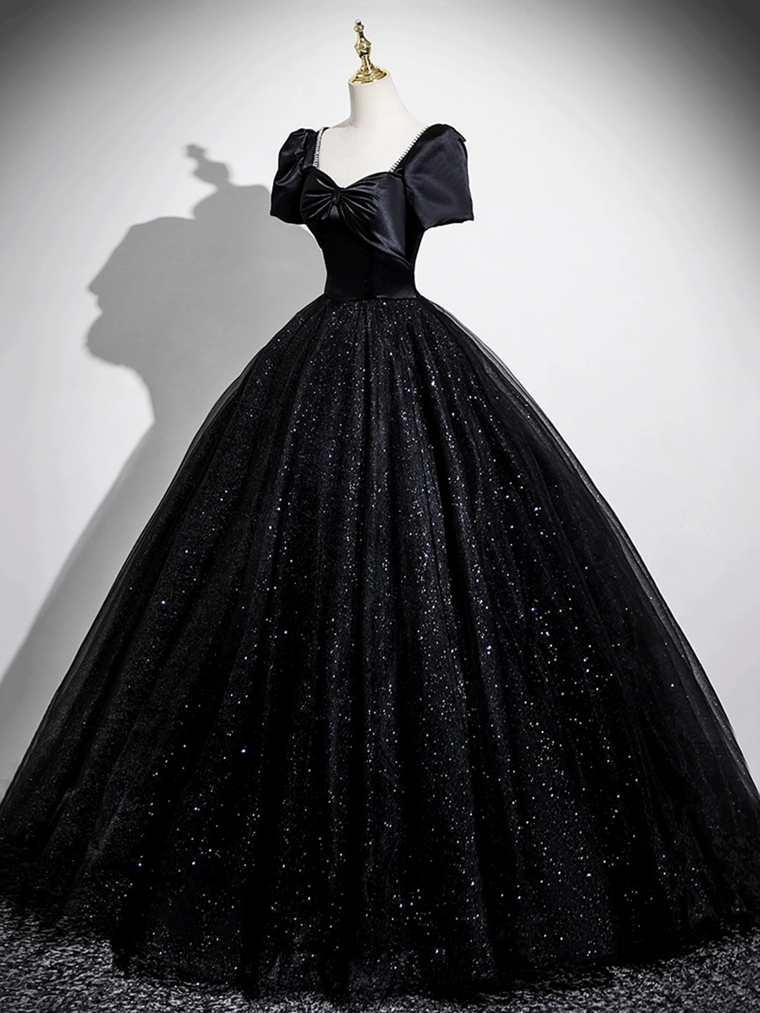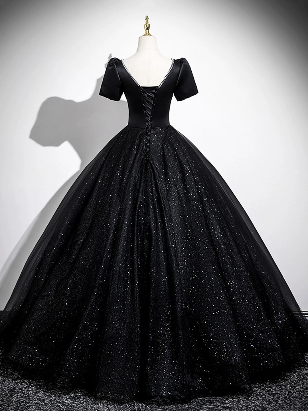 - Black Satin and Glitter Tulle Long A-Line Prom Party Dress -