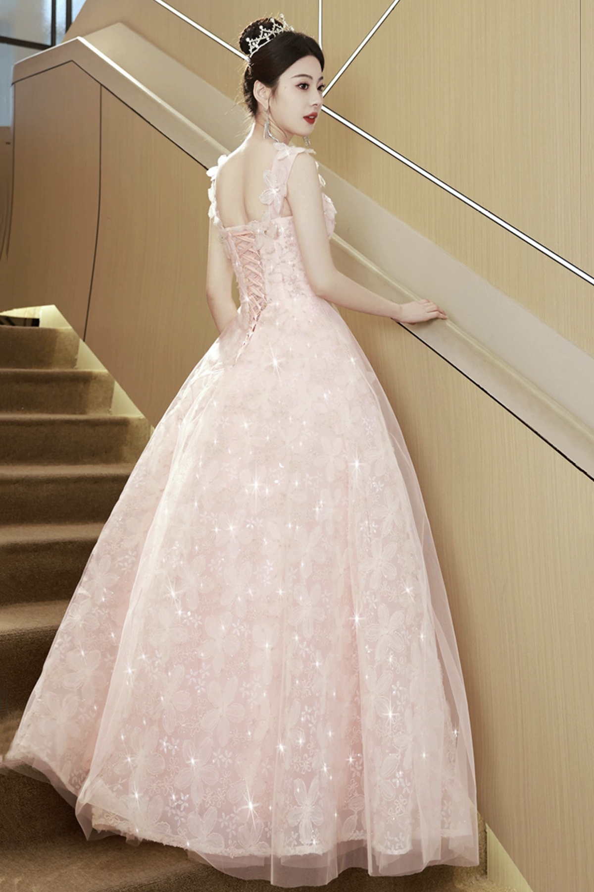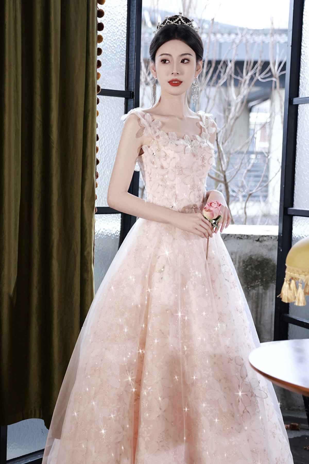 - Pink Flowers Tulle Long Prom Dress, Pink Evening Party Dress -