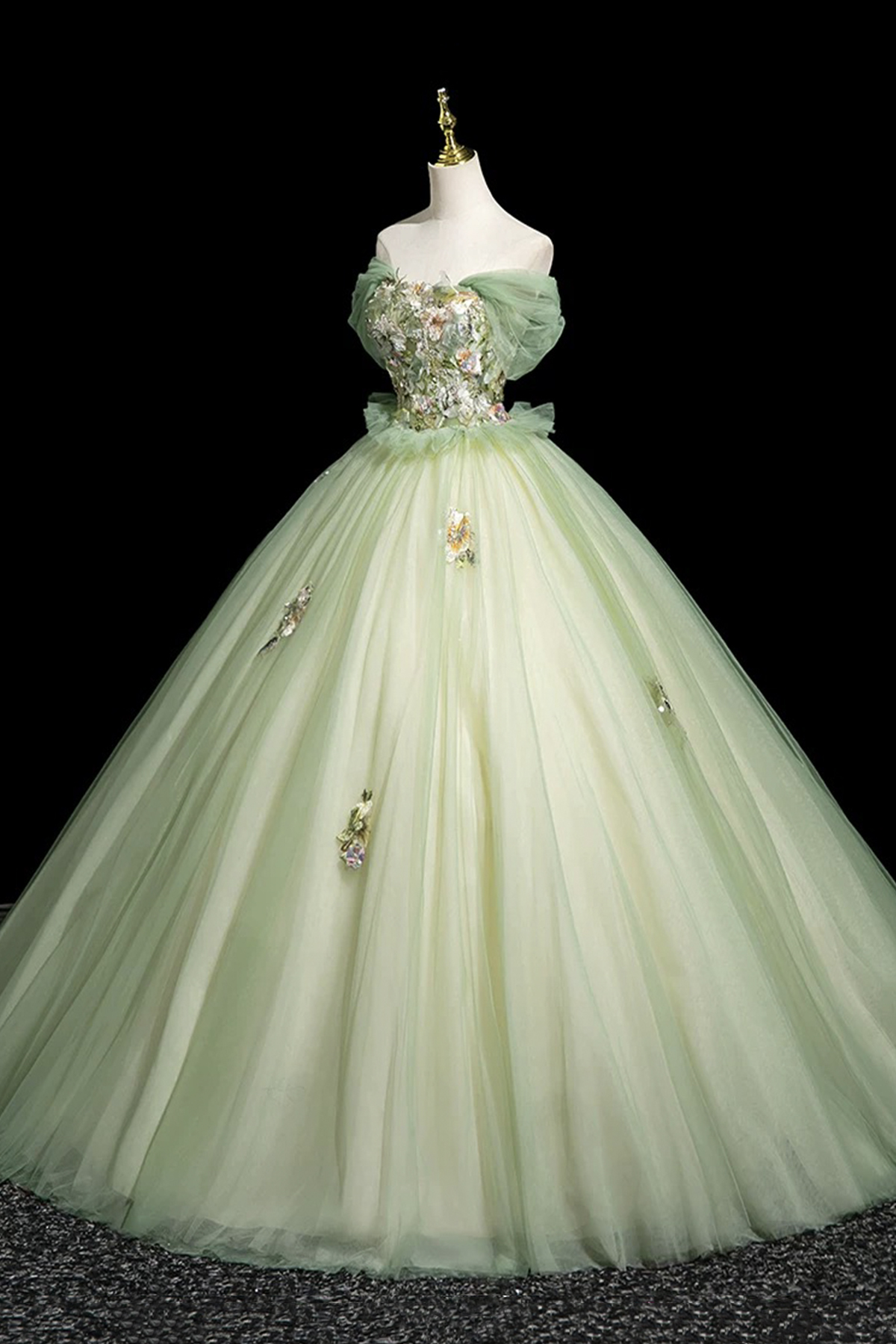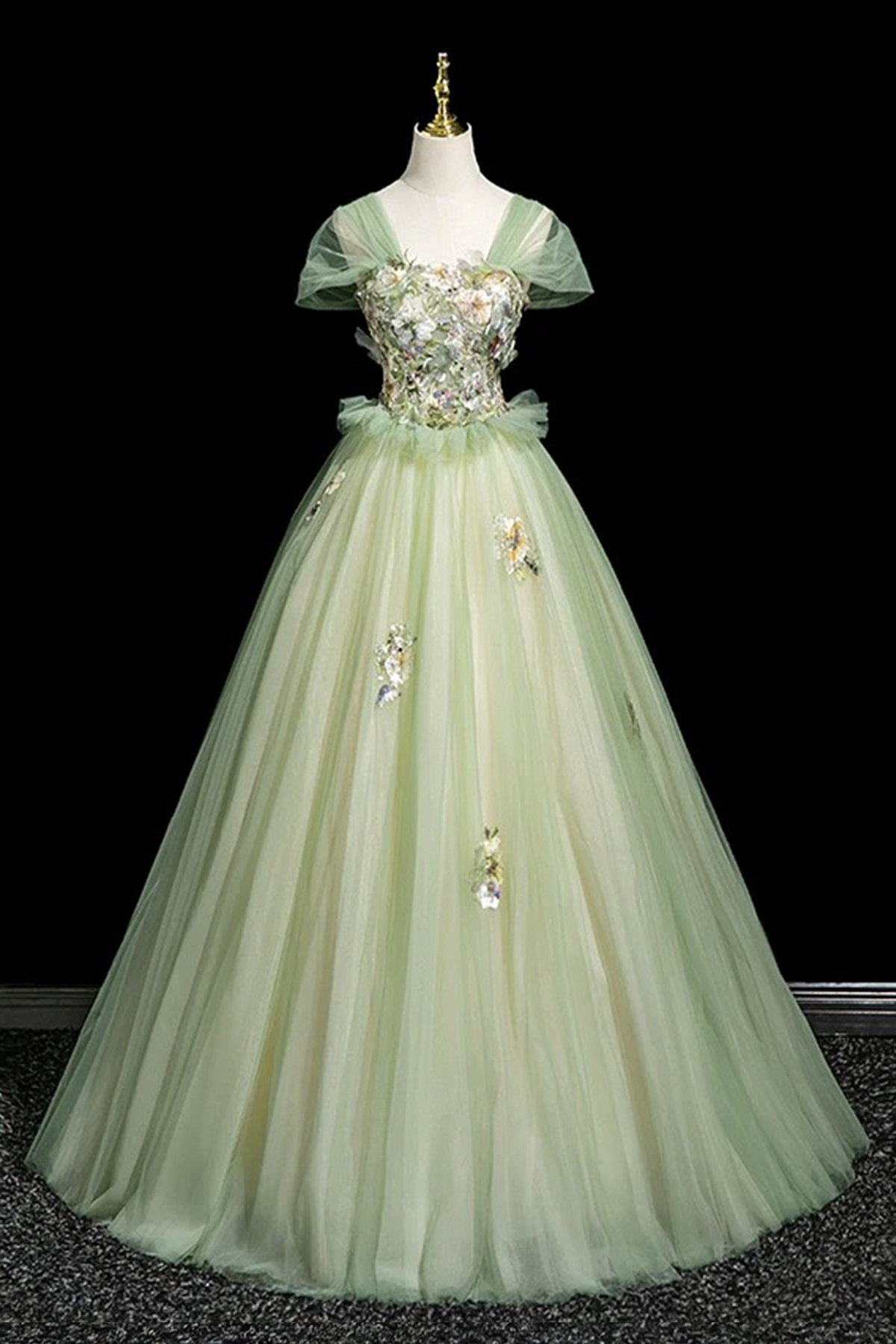 - Green Tulle Floral Long A-Line Off the Shoulder Prom Party Dress -