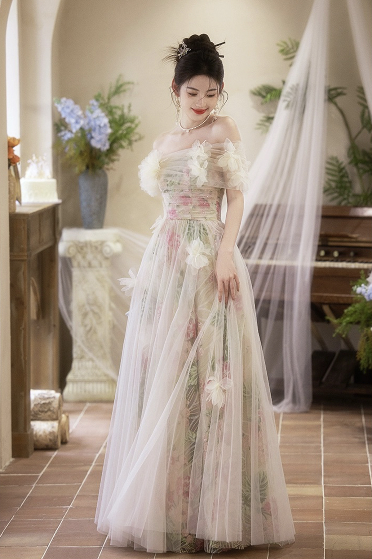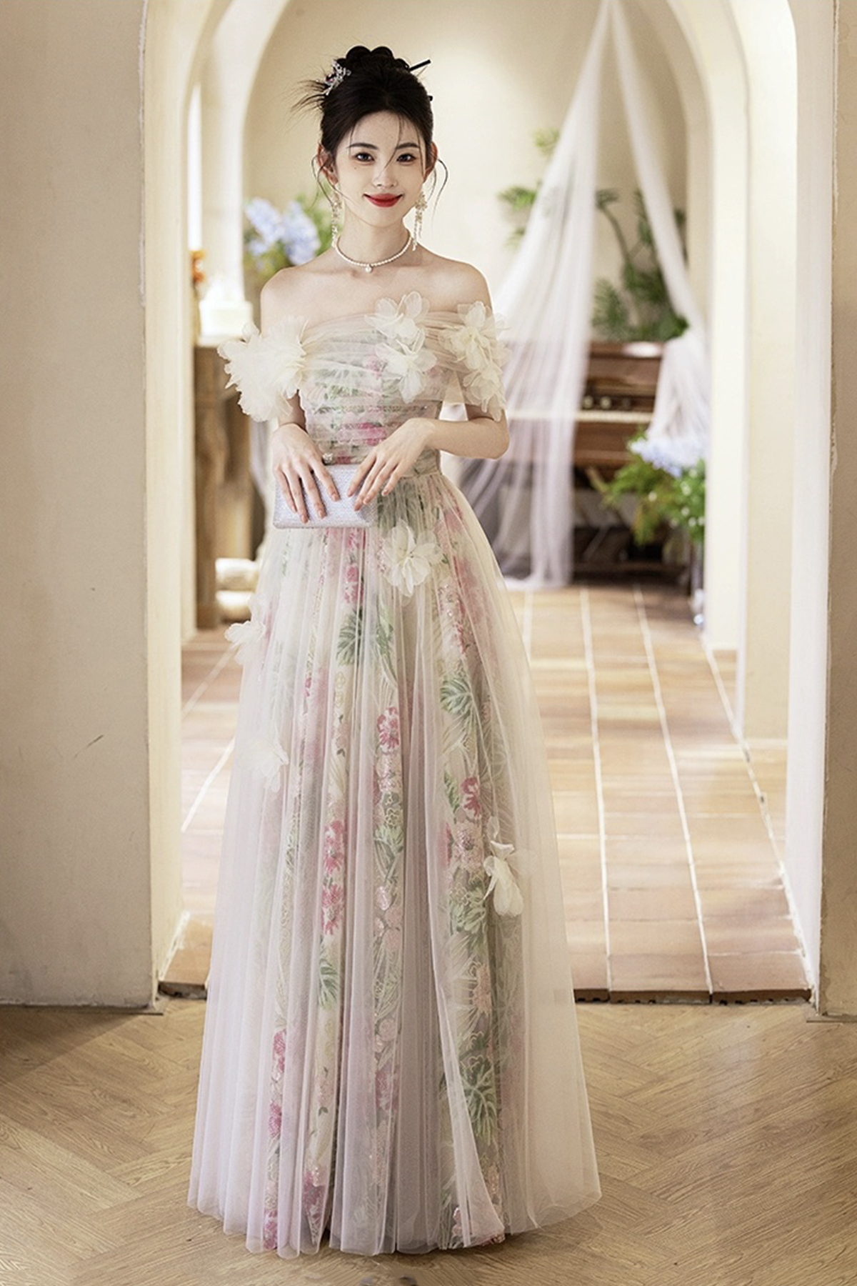 - Lovely Tulle Floral Long Prom Dress, A-Line Off the Shoulder Party Dress -