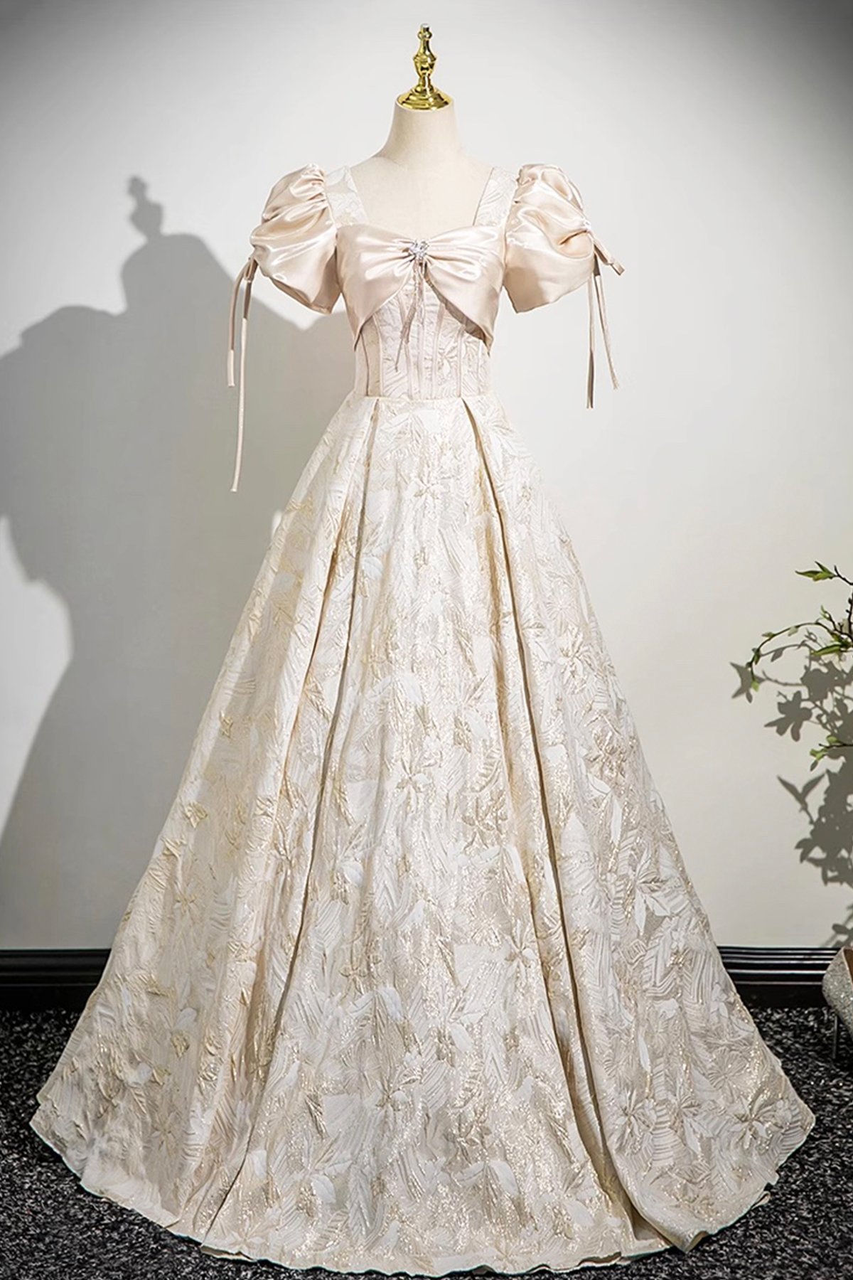 - Champagne Print Long Prom Dress, A-Line Short Sleeve Party Dress -