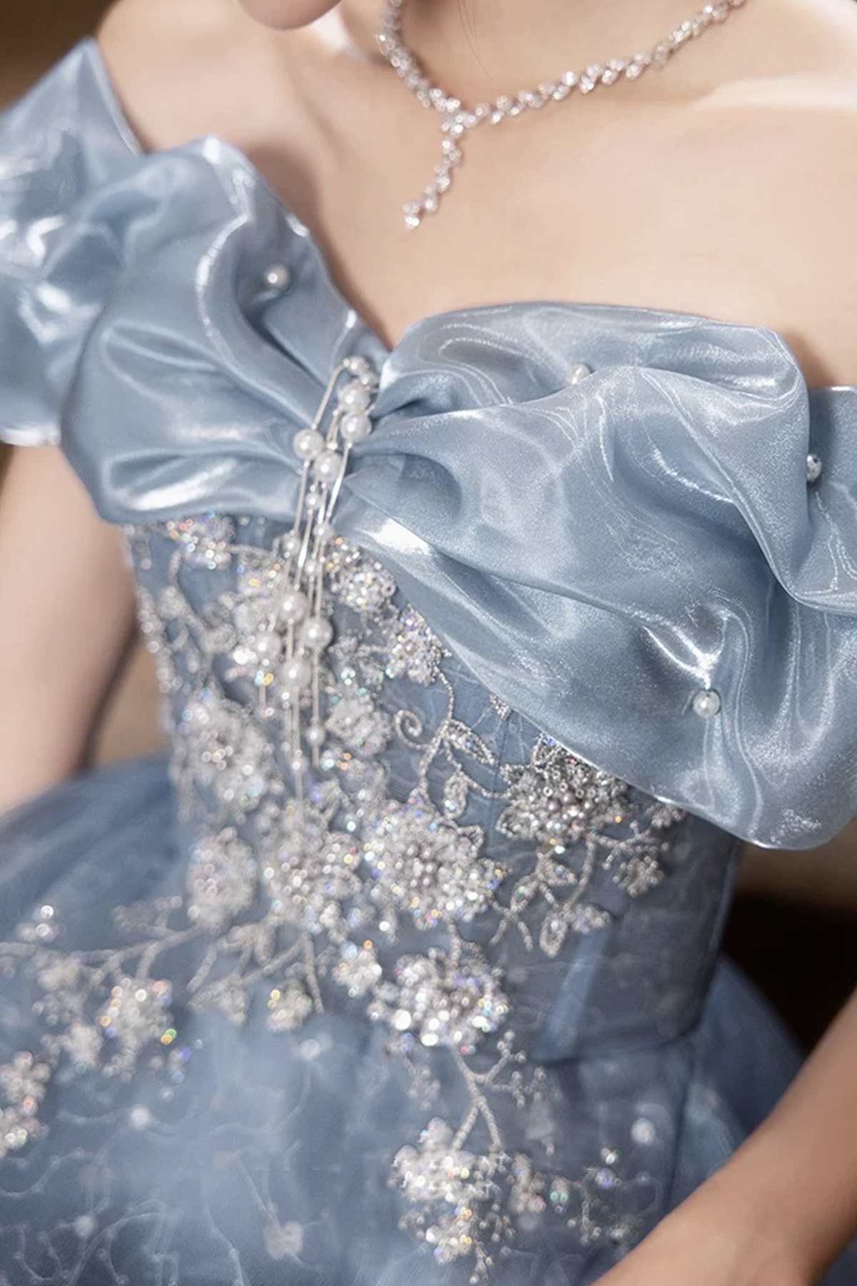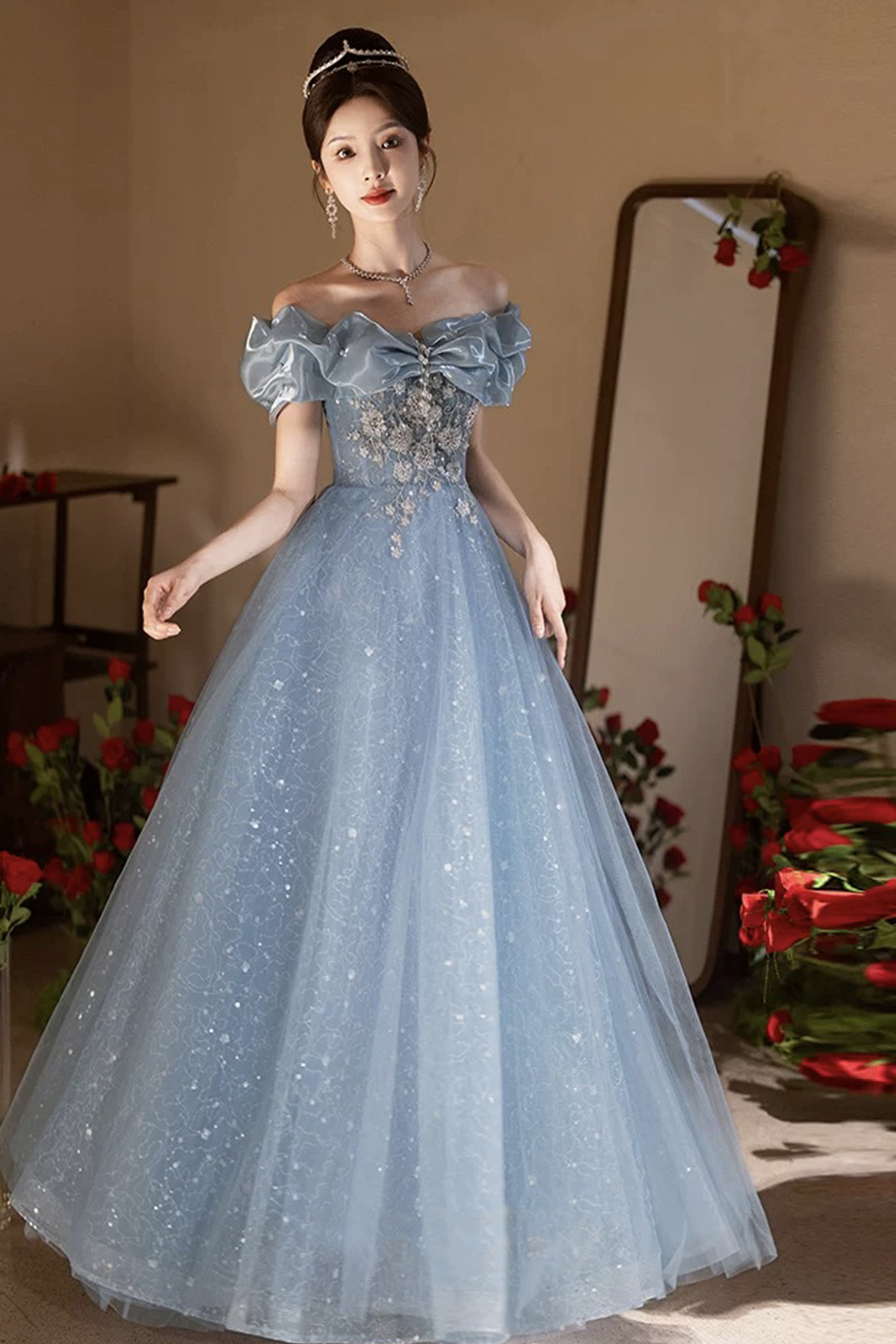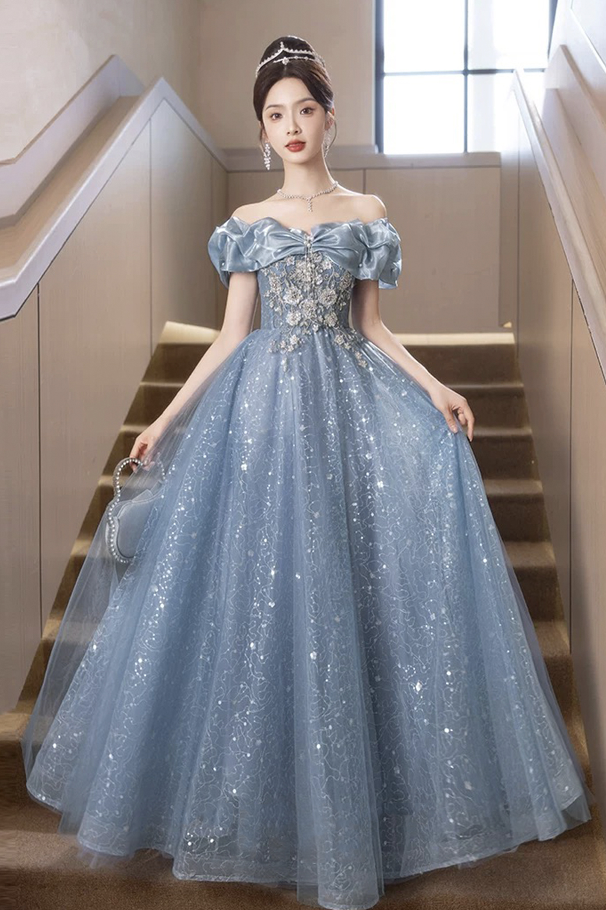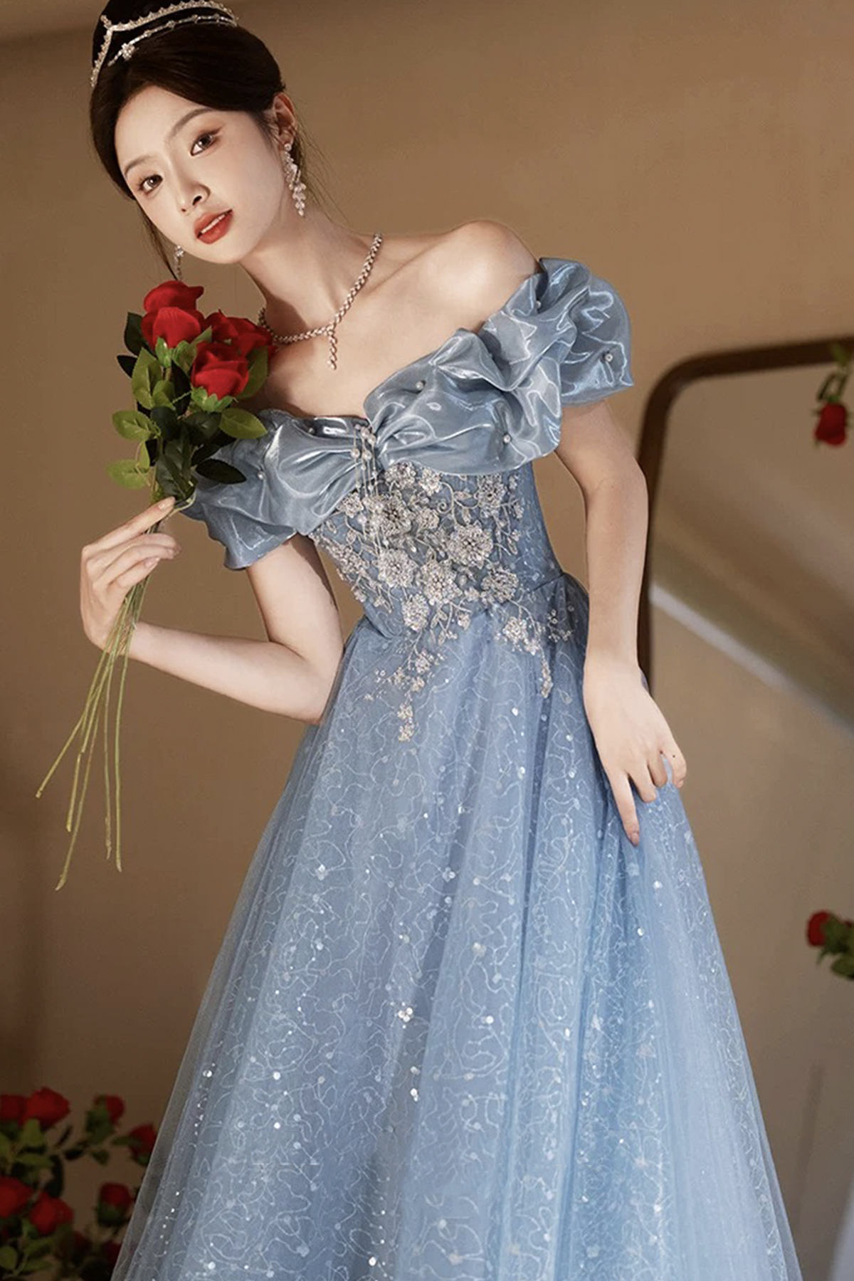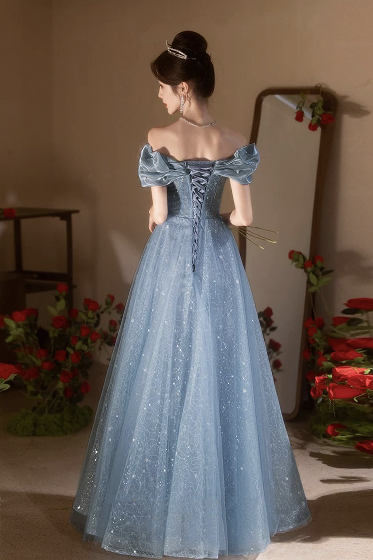 Blue Tulle Sequins Long A-Line Prom Party Dress