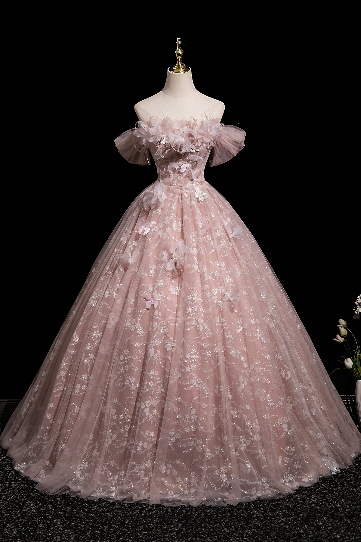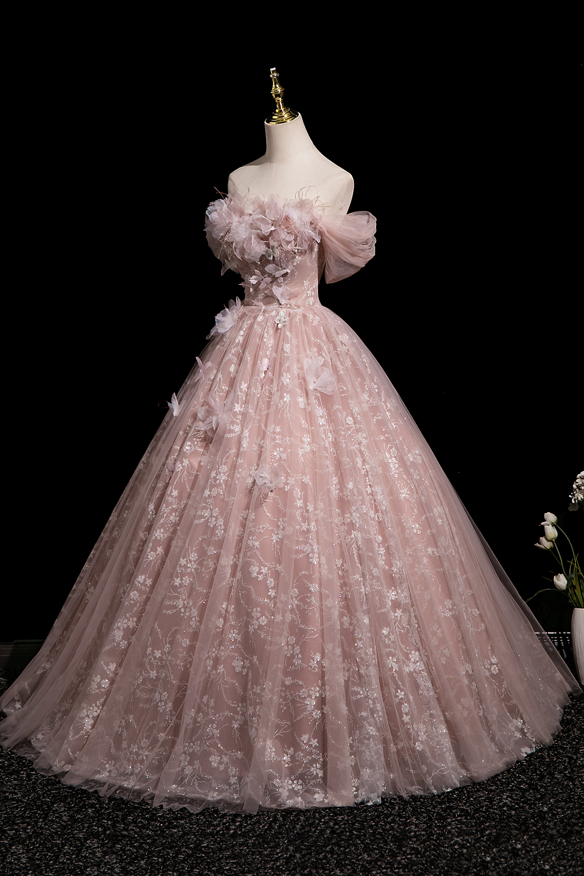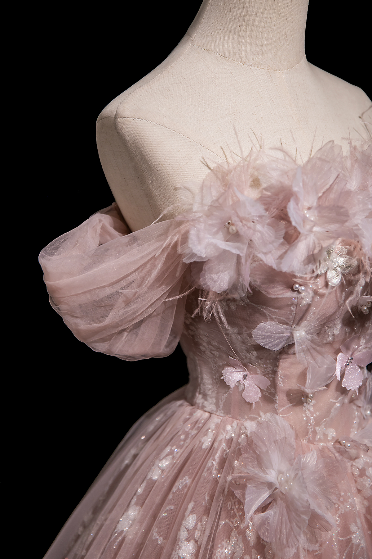 - Pink Tulle Flowers Long Prom Dress, A-Line Fairy Evening Dress -
