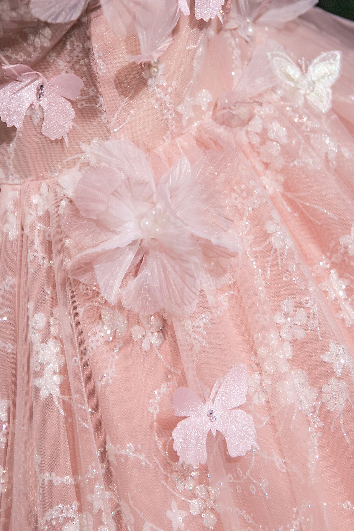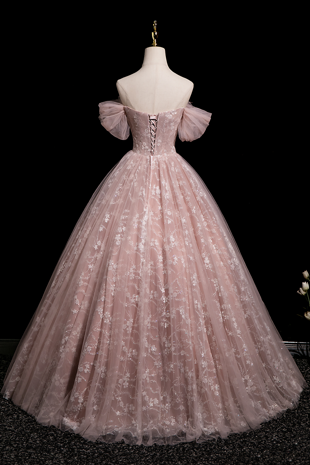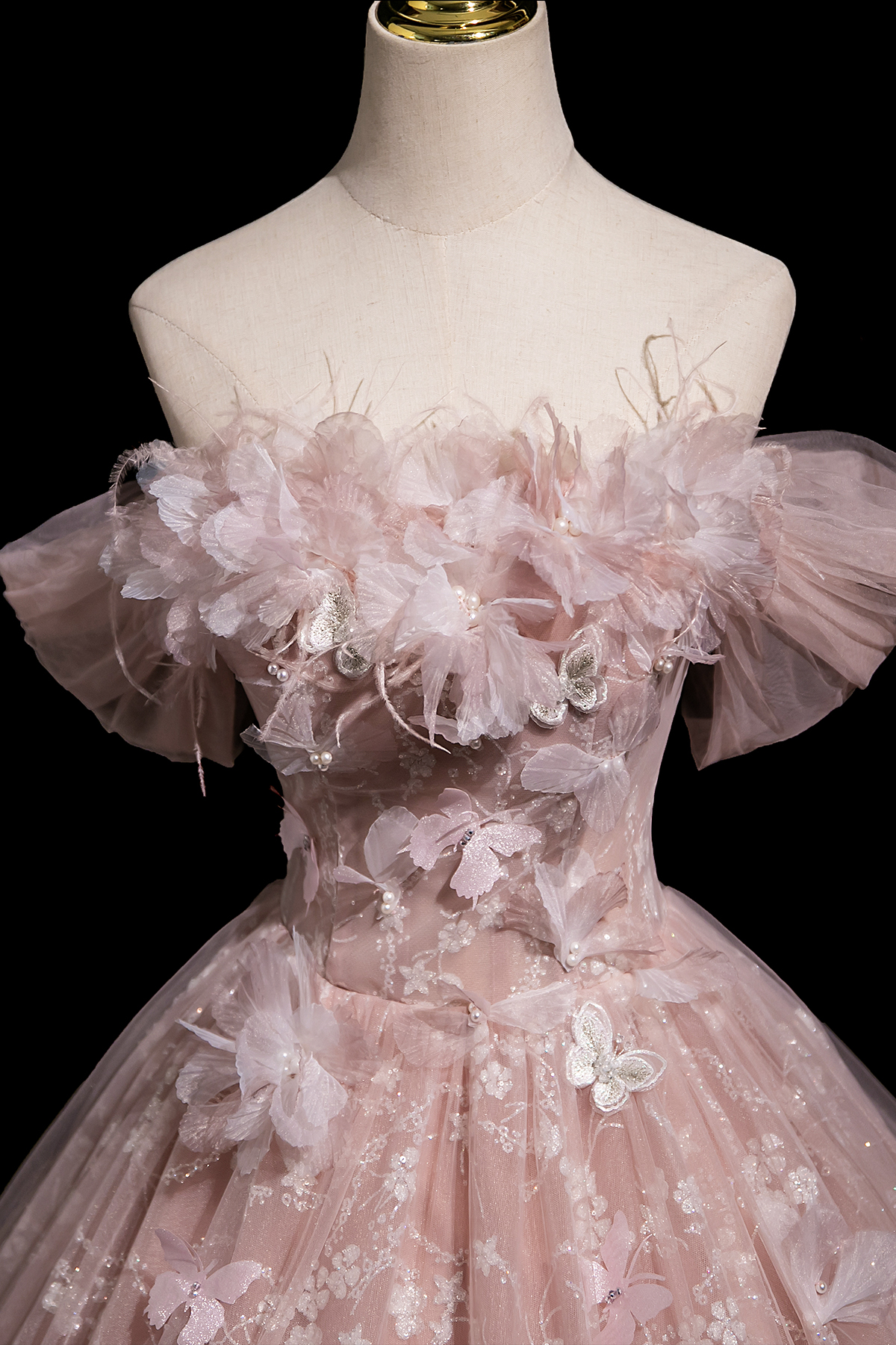 - Pink Tulle Flowers Long Prom Dress, A-Line Fairy Evening Dress -