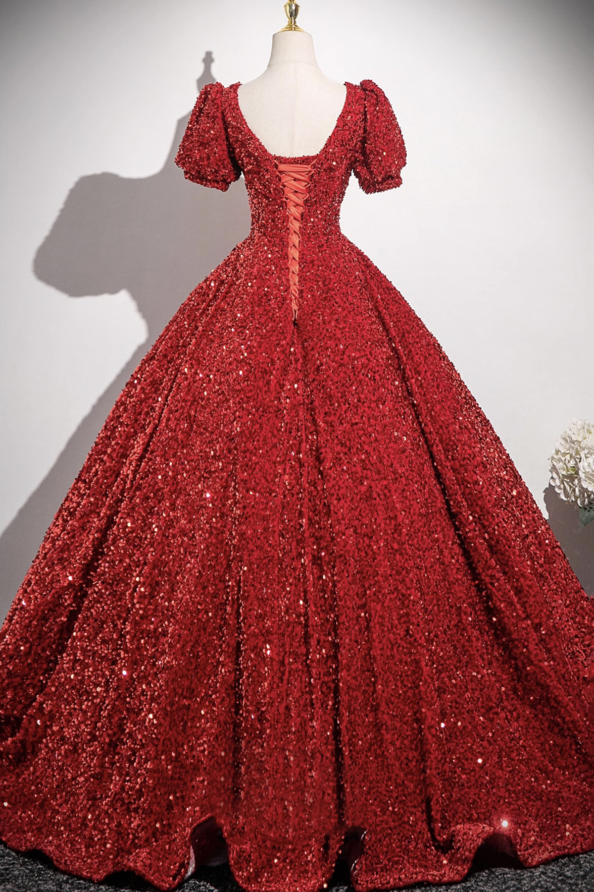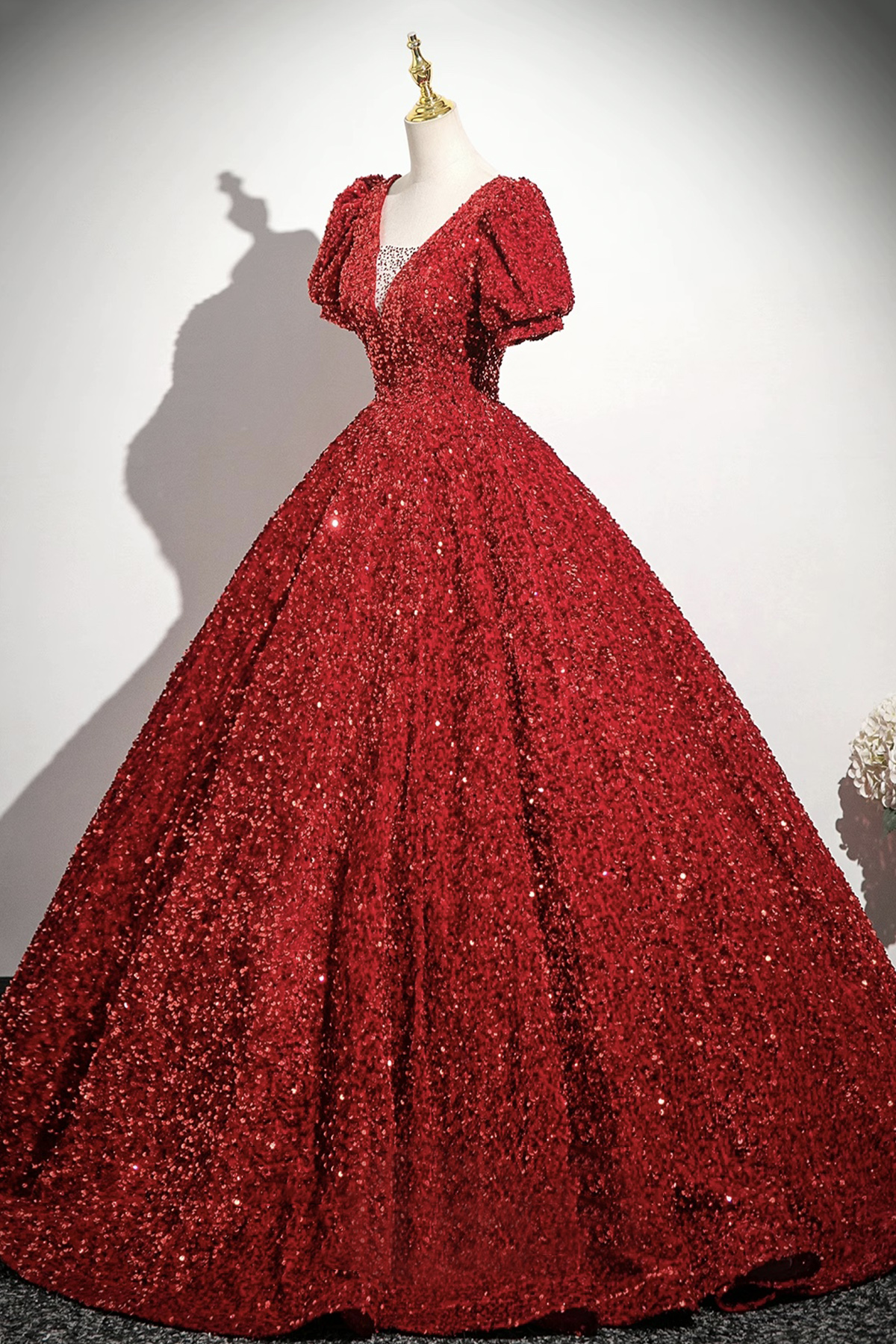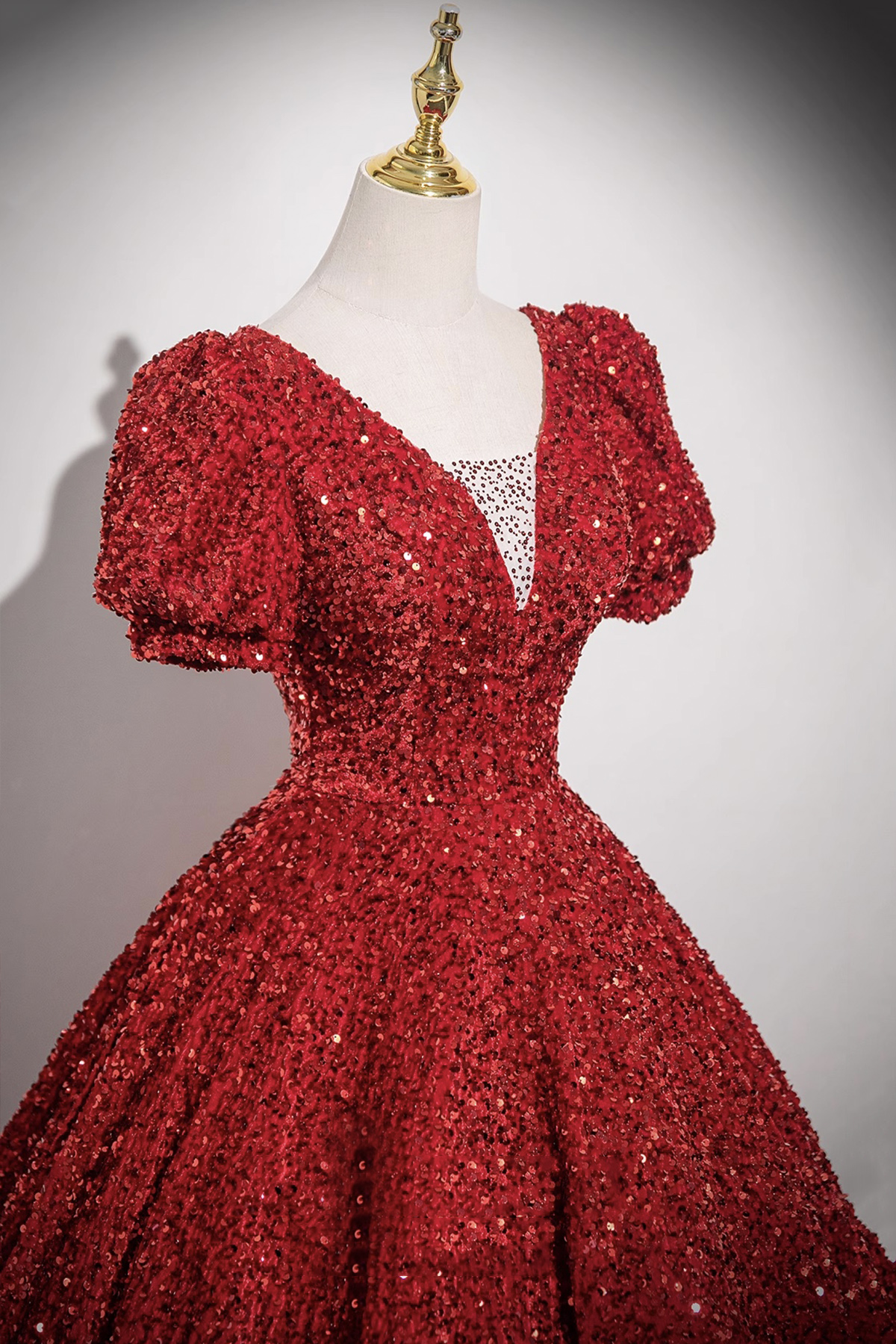 - Red Sequins Long Prom Dress, A-Line Short Sleeve Formal Dress -