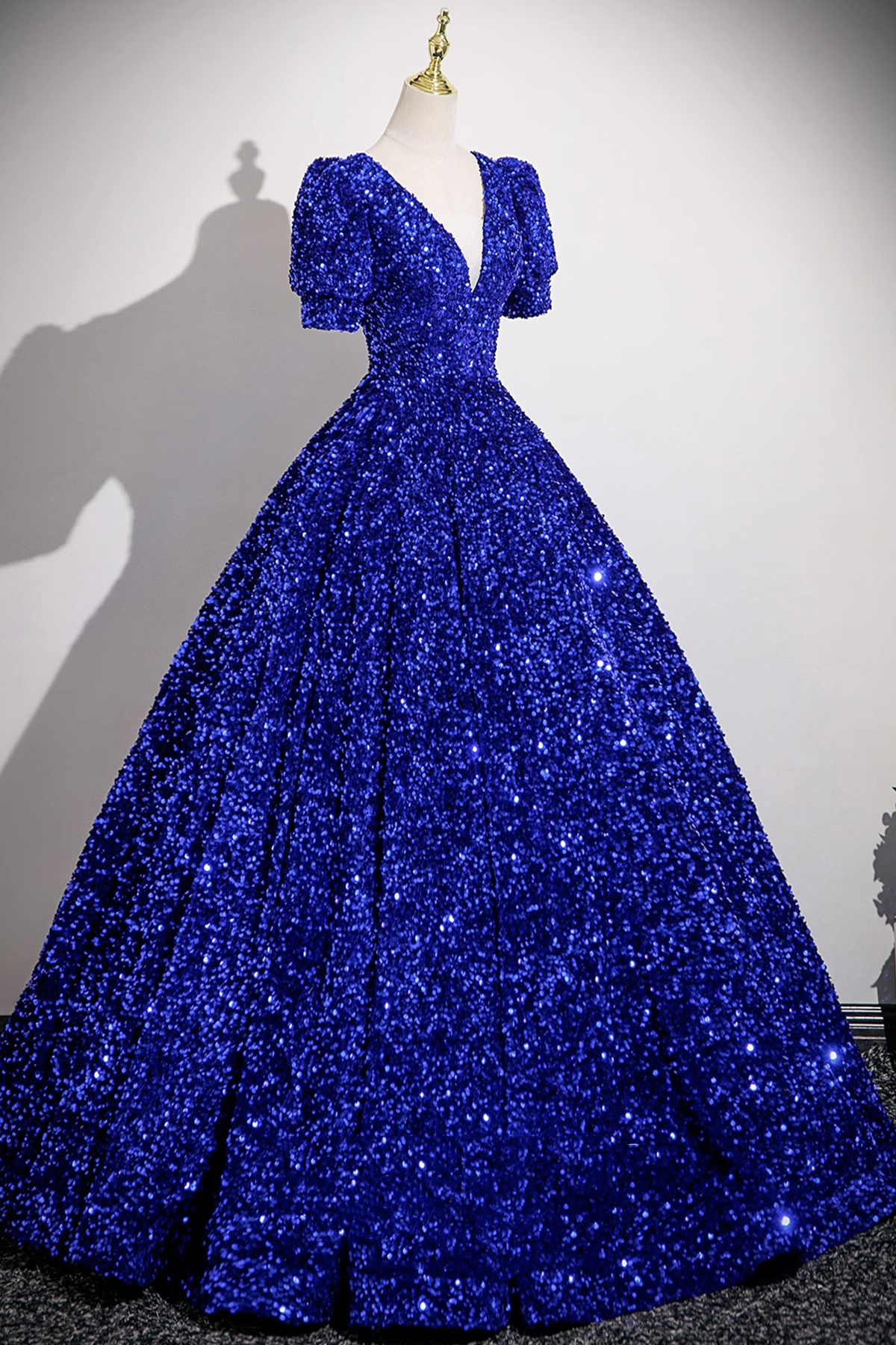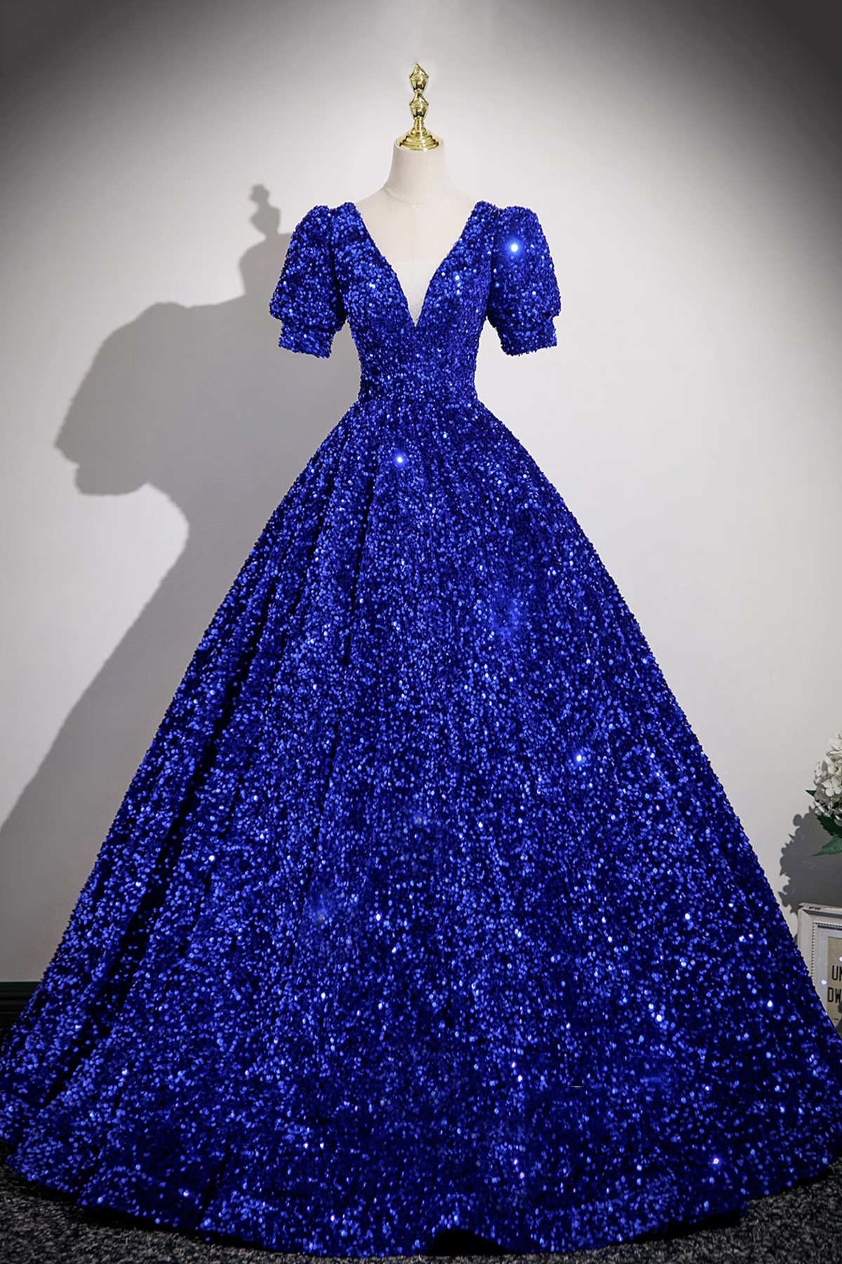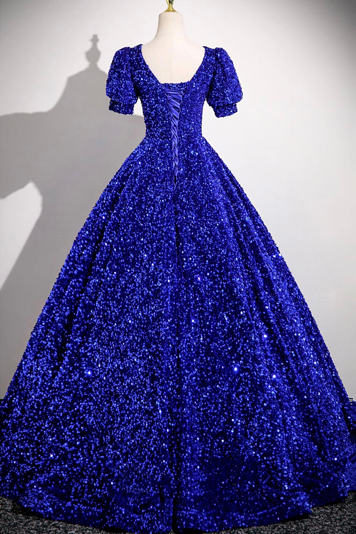 - Blue Sequins Long Prom Dress, A-Line Short Sleeve Formal Dress -
