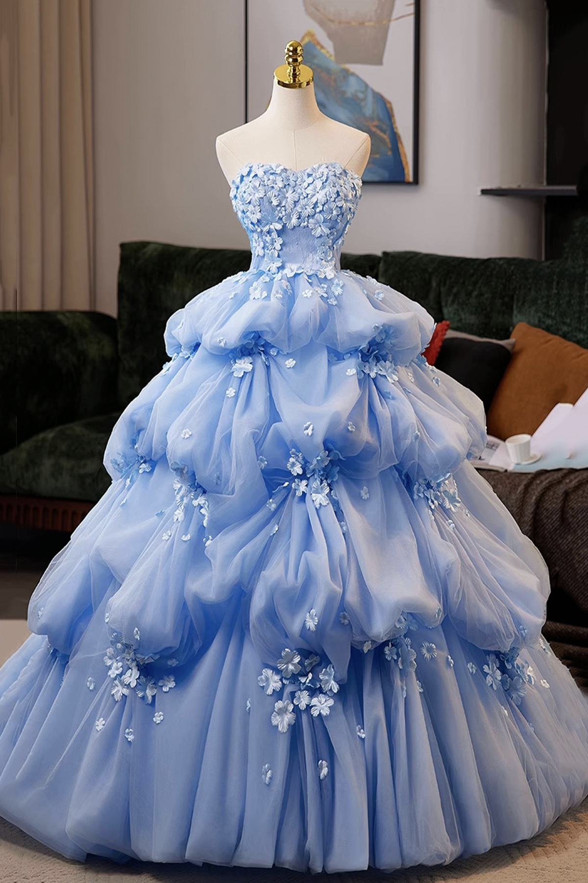 Blue Tulle Flowers Long A-Line Prom Party Dress