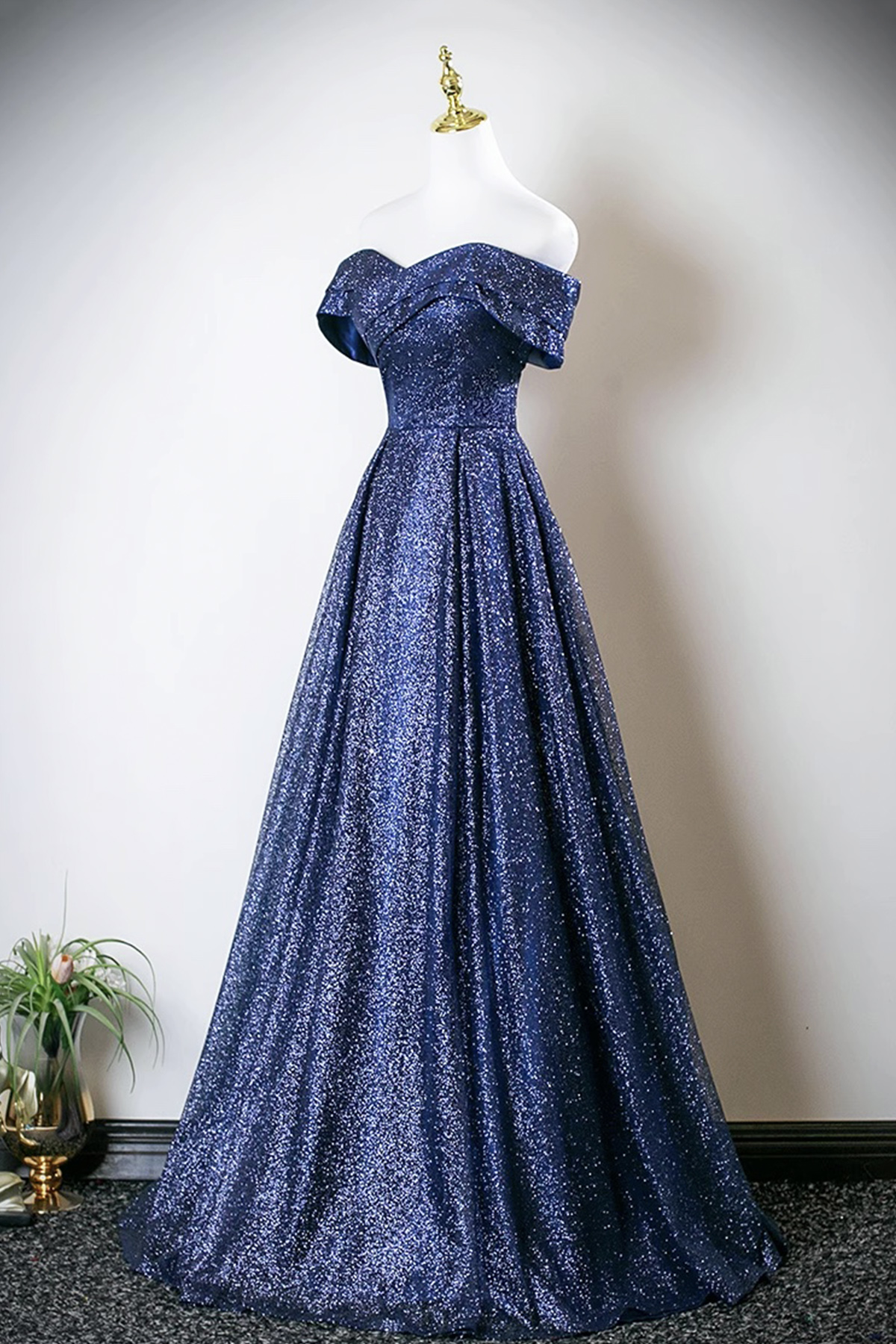 - Blue Tulle Long Prom Dress, Off the Shoulder A-Line Party Dress -