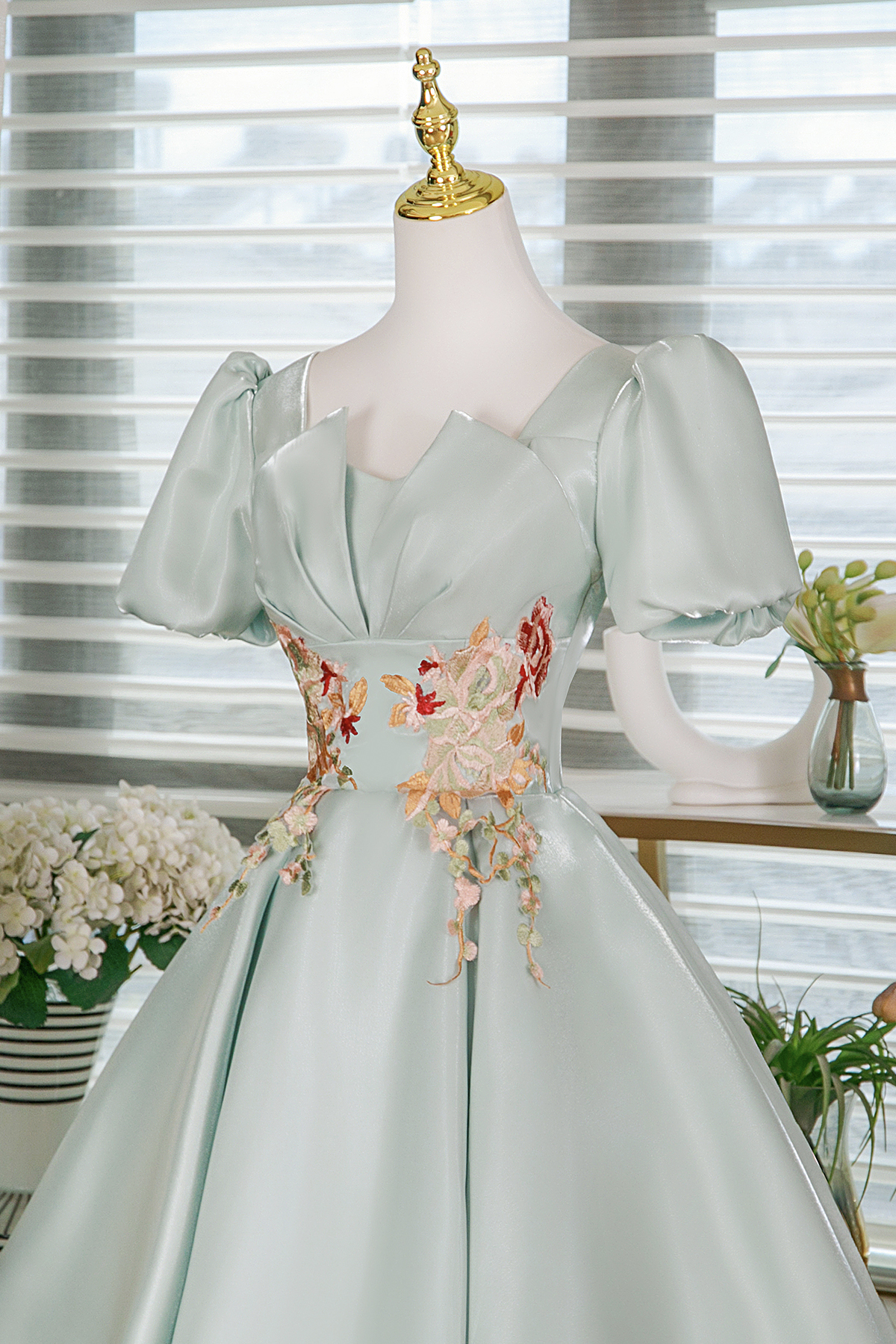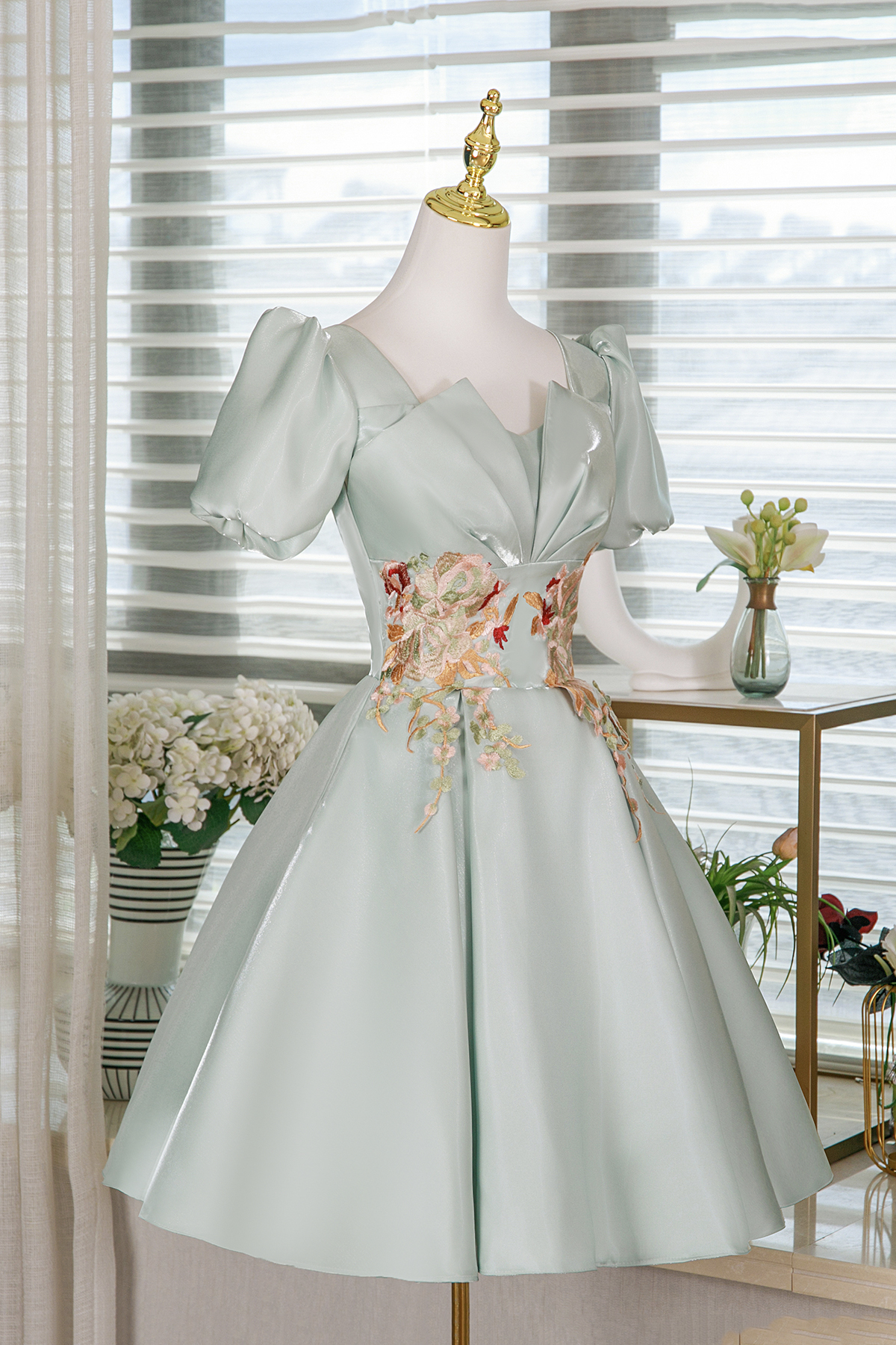 - Light Green Satin Short Prom Dress, A-Line Short Sleeve Evening Party Dress -