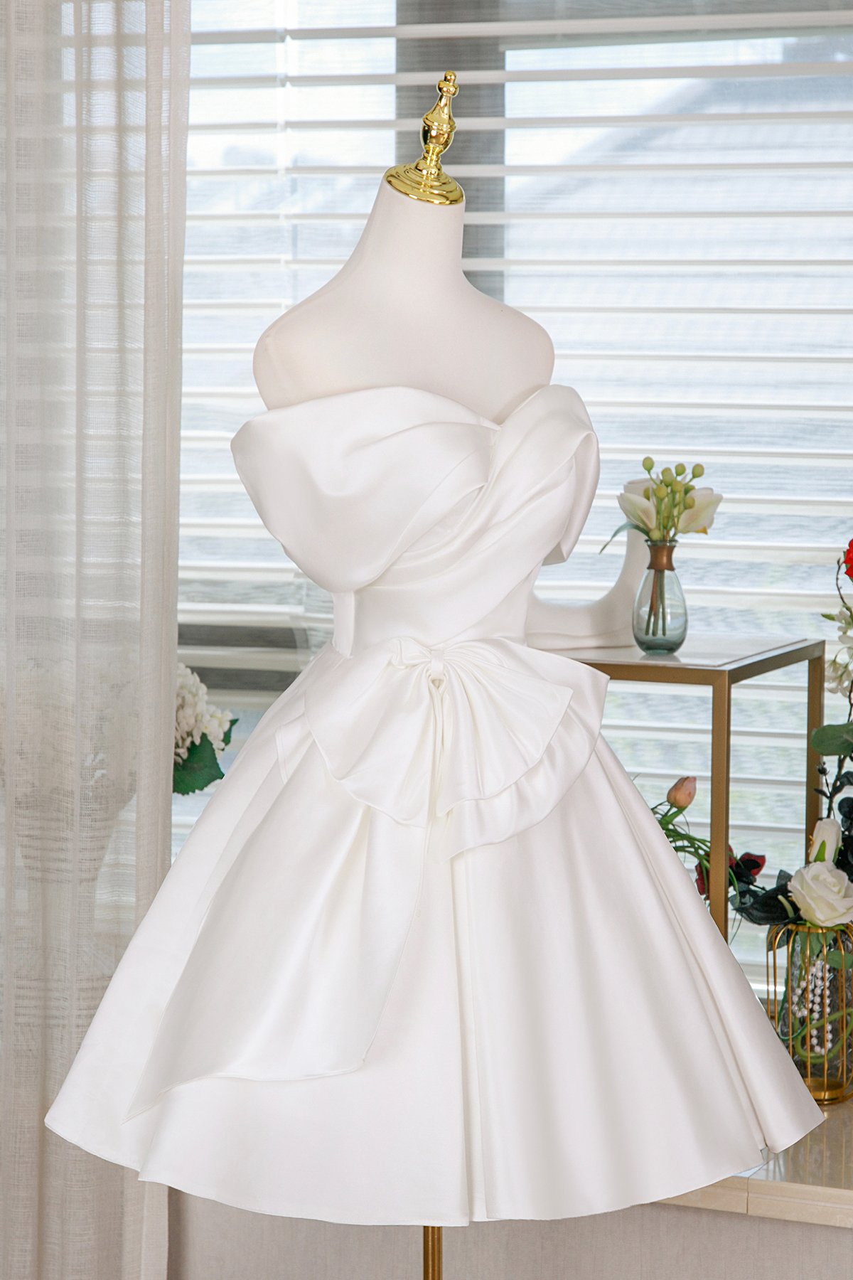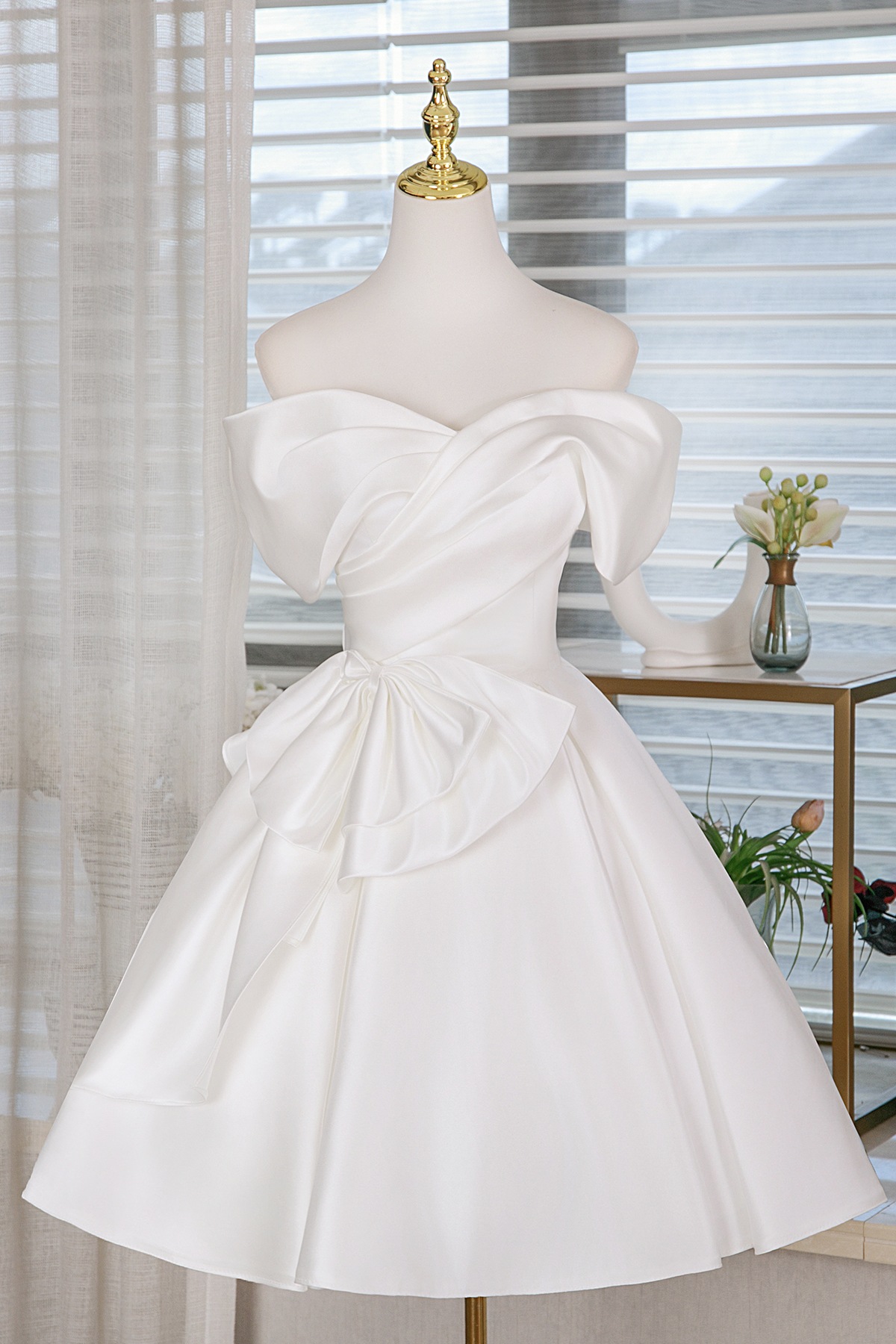 - White Satin Short Prom Dress, A-Line Off the Shoulder Evening Party Dress -