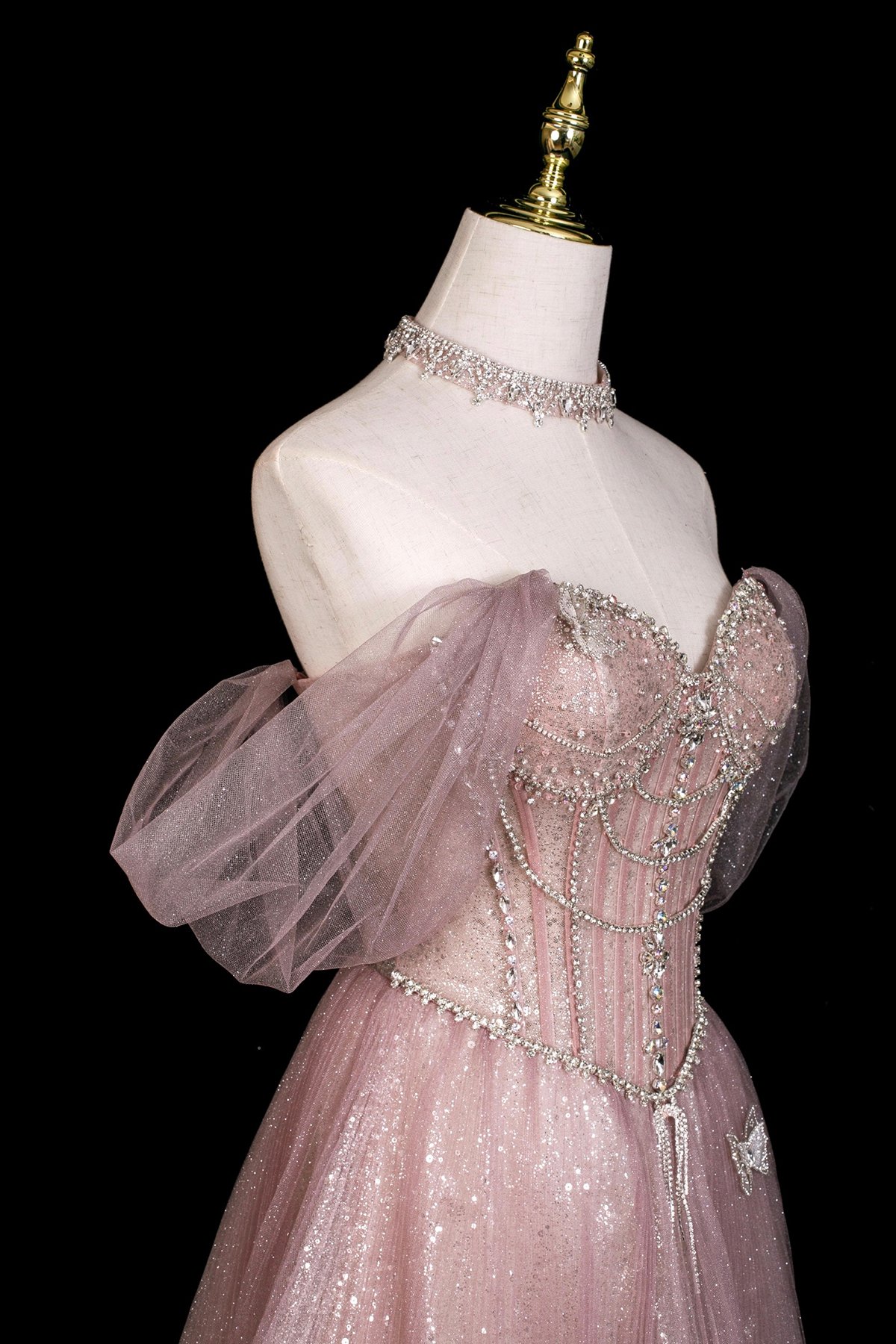 - Pink Tulle Off the Shoulder Long A-Line Prom Party Dress with Rhinestones -