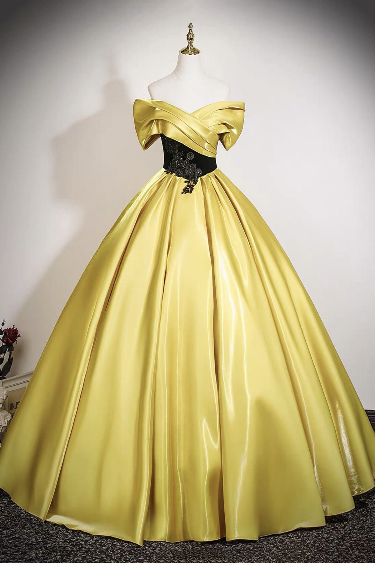 - Yellow Satin Lace Long A-Line Prom Party Dress -