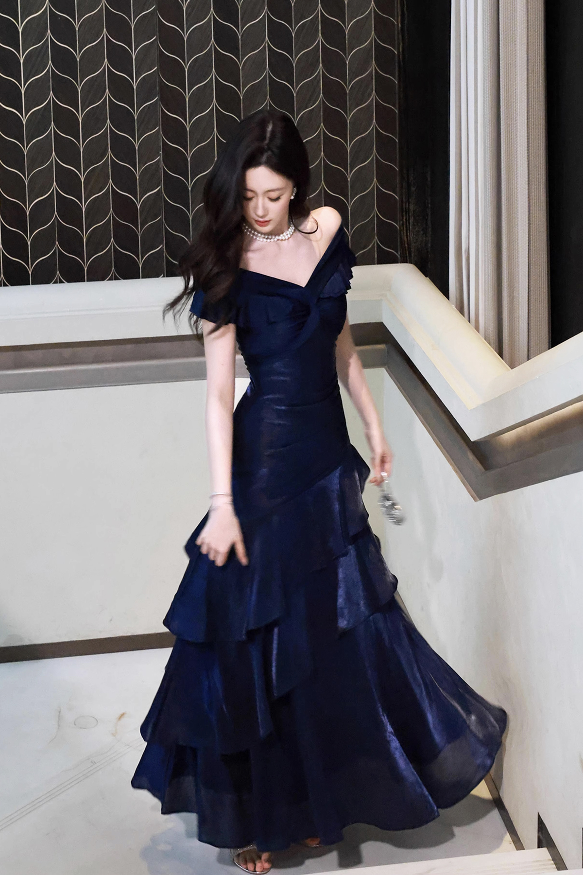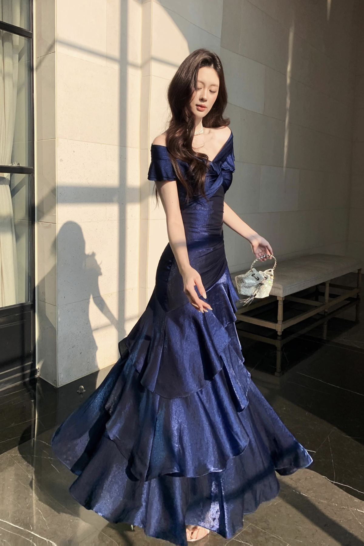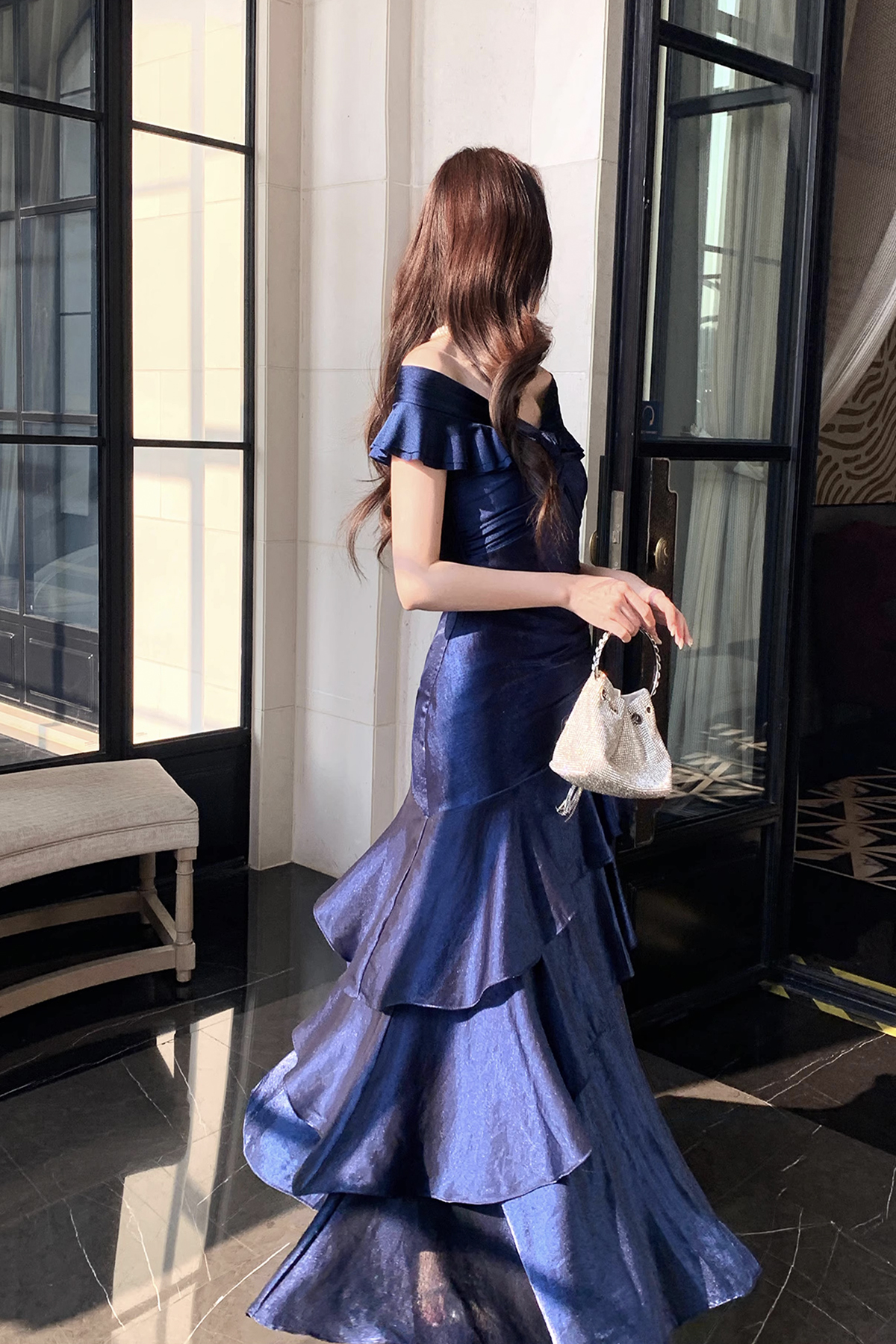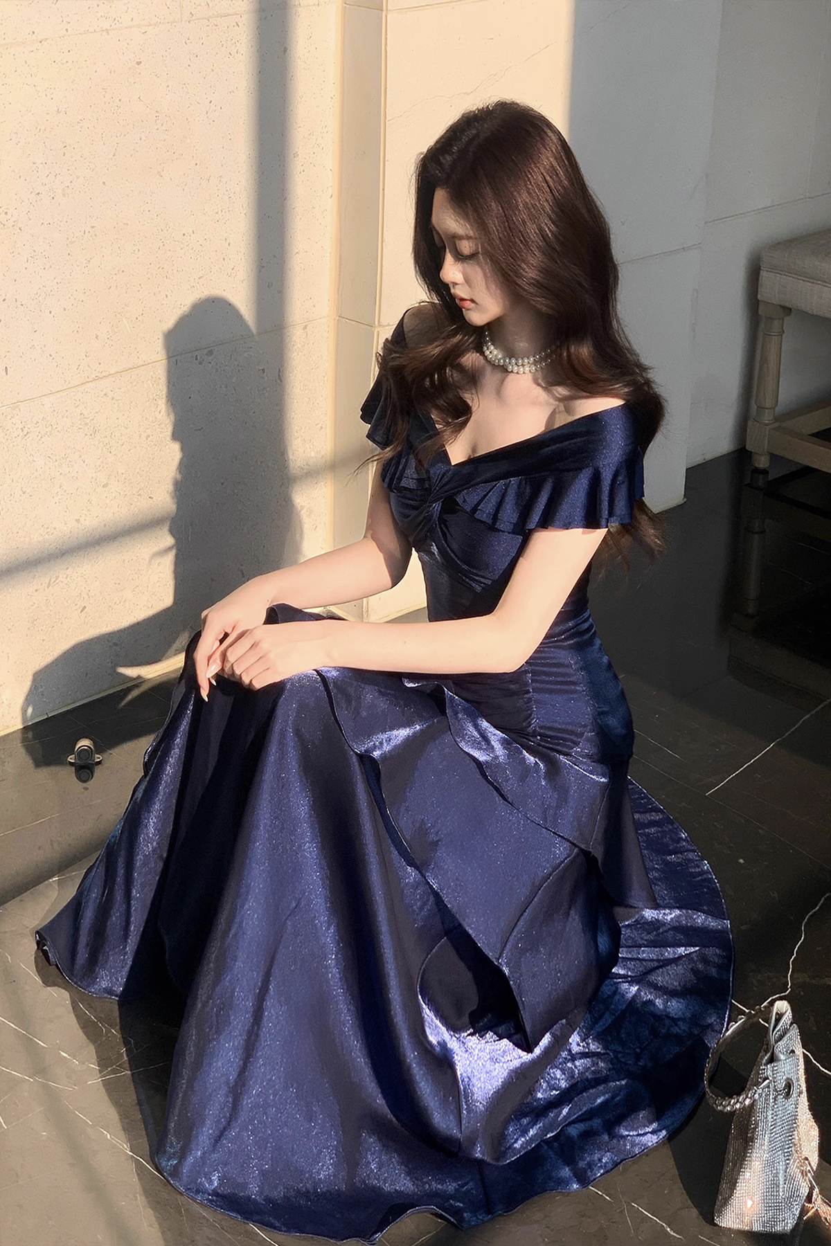 - Navy Satin Mermaid Prom Dress Off Shoulder Ruffle Trim Evening Gown -