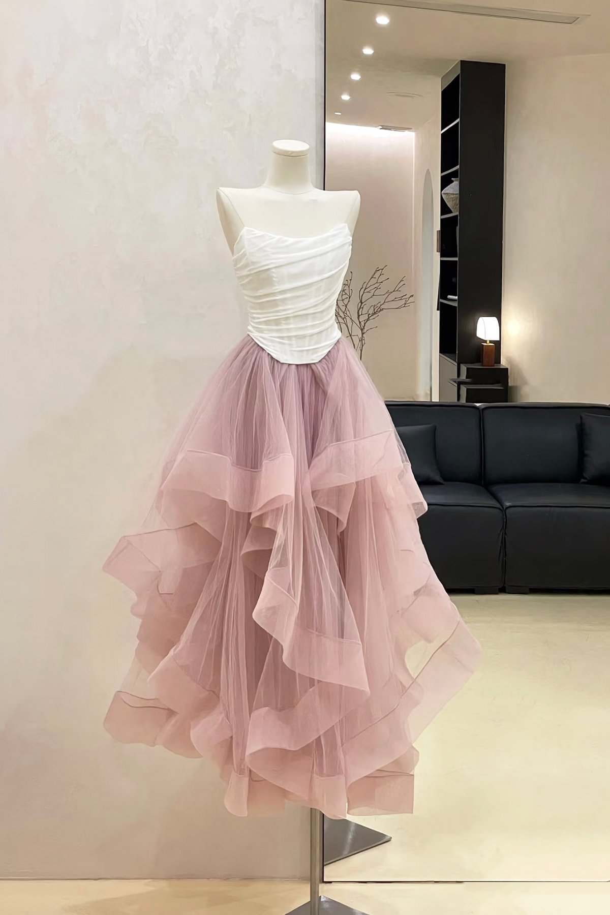 - Romantic Pink Tulle Party Dress with White Ruched Strapless Bodice -