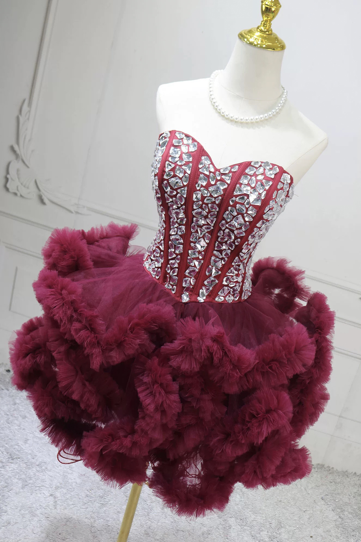 - Burgundy Tulle Strapless Short Prom Dress with Rhinestone Corset -